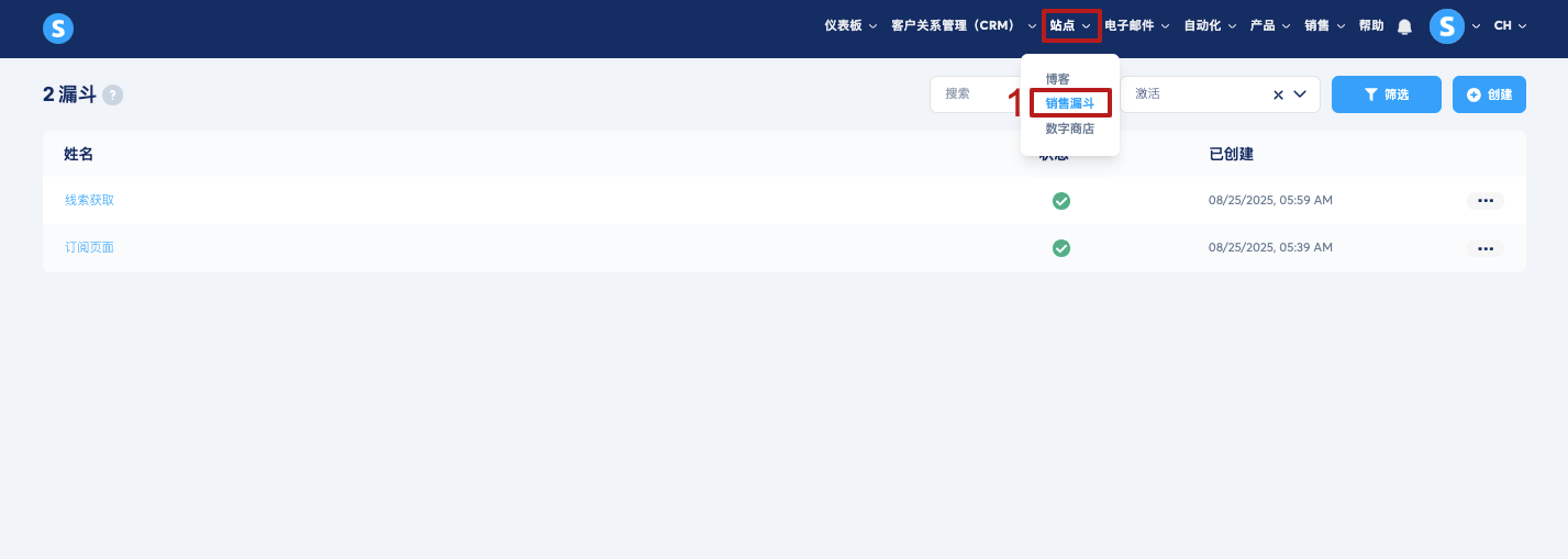 在菜单中导航至“站点”选项卡,然后点击“销售漏斗”以显示您的漏斗列表(1)