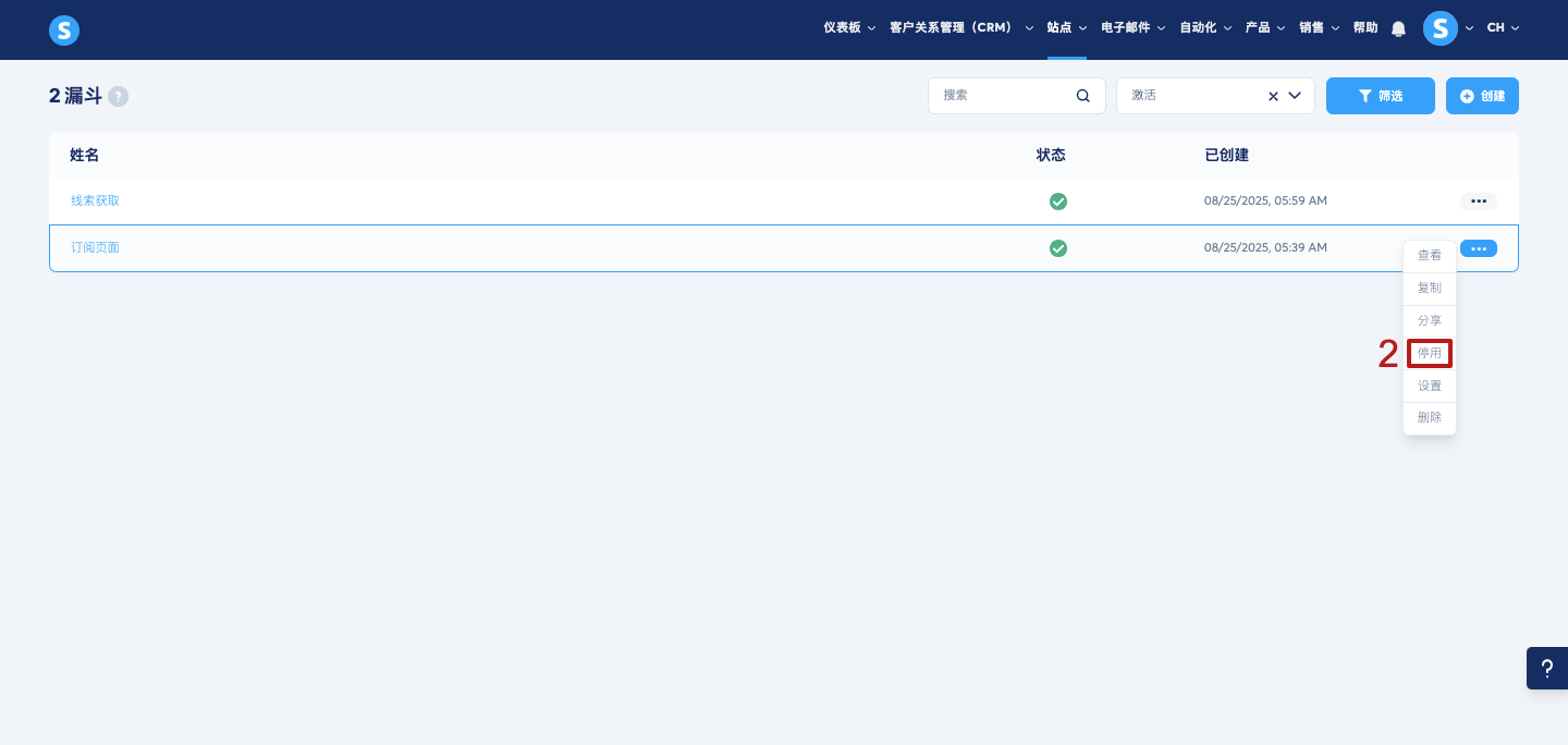 找到要停用的漏斗,点击三个点(...),然后点击“停用”(2)