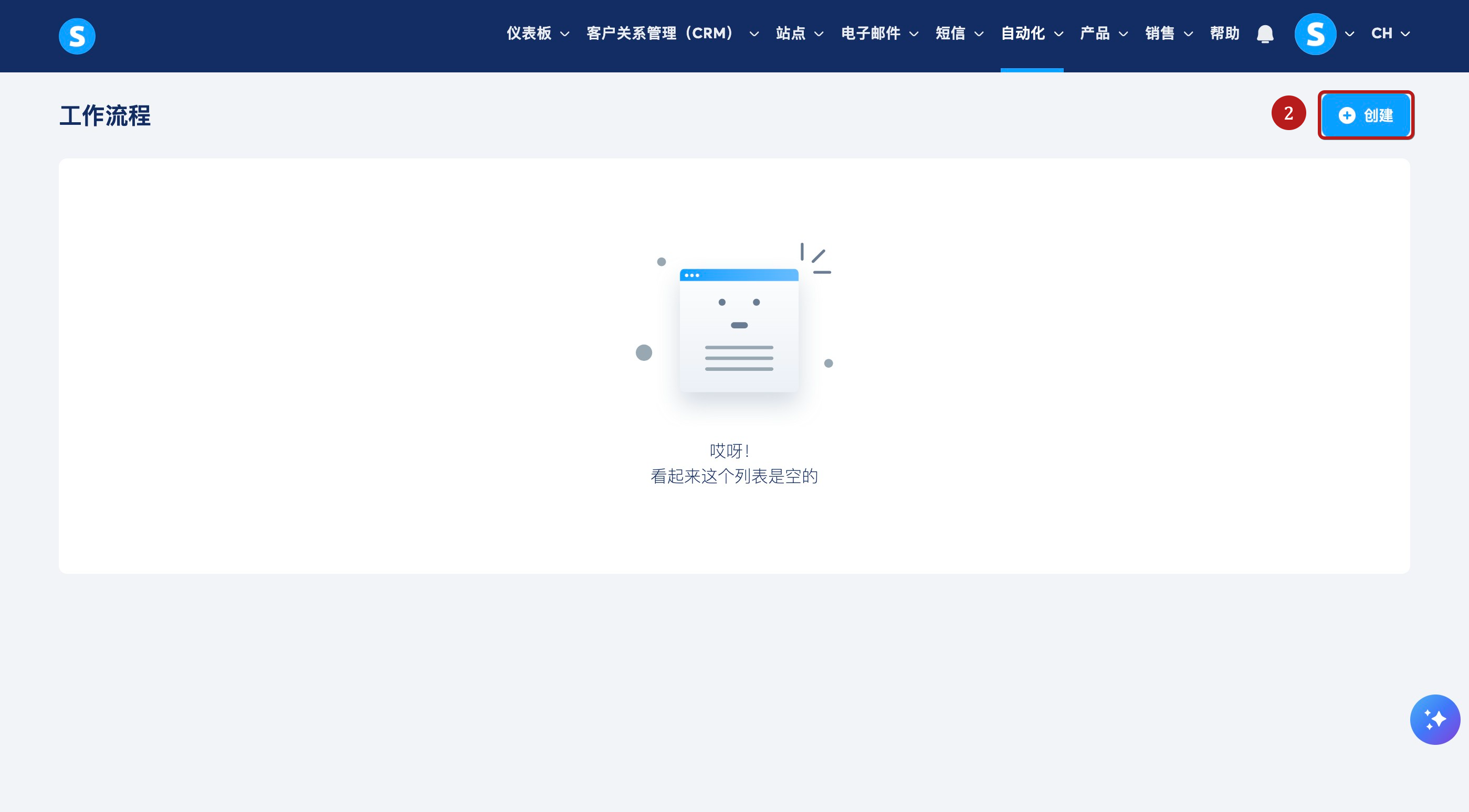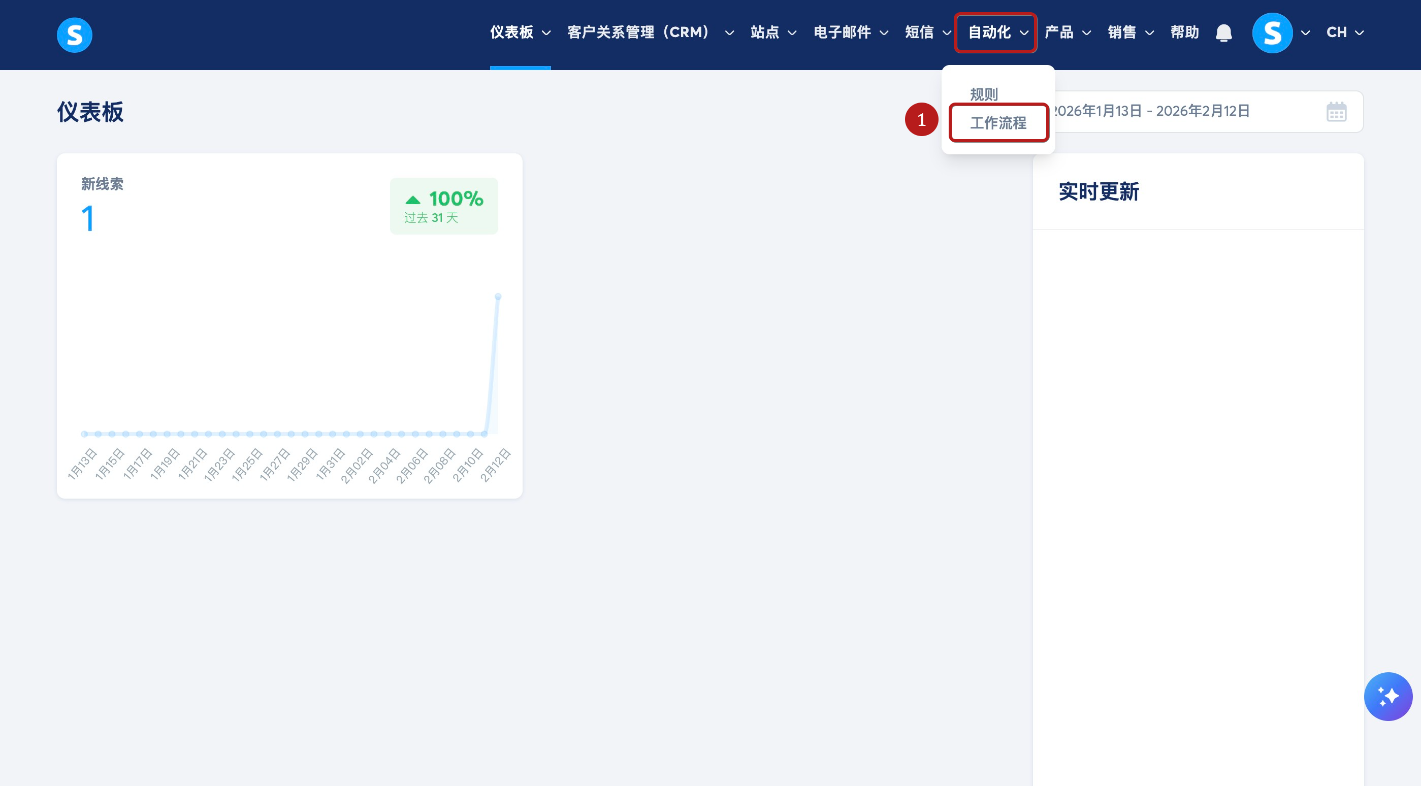 登录 systeme.io 账户,点击菜单栏上的自动化选项卡,然后点击工作流程(1)。
