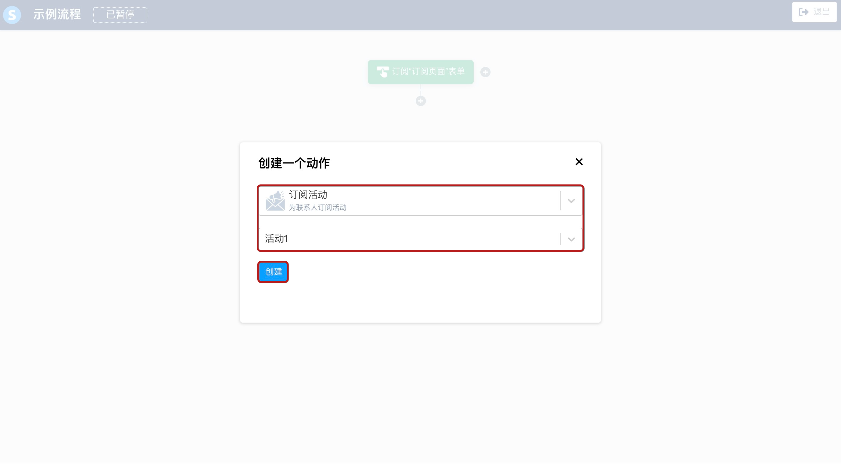 - 创建一个操作,选择订阅活动选项,然后从选项列表中选择活动 1。