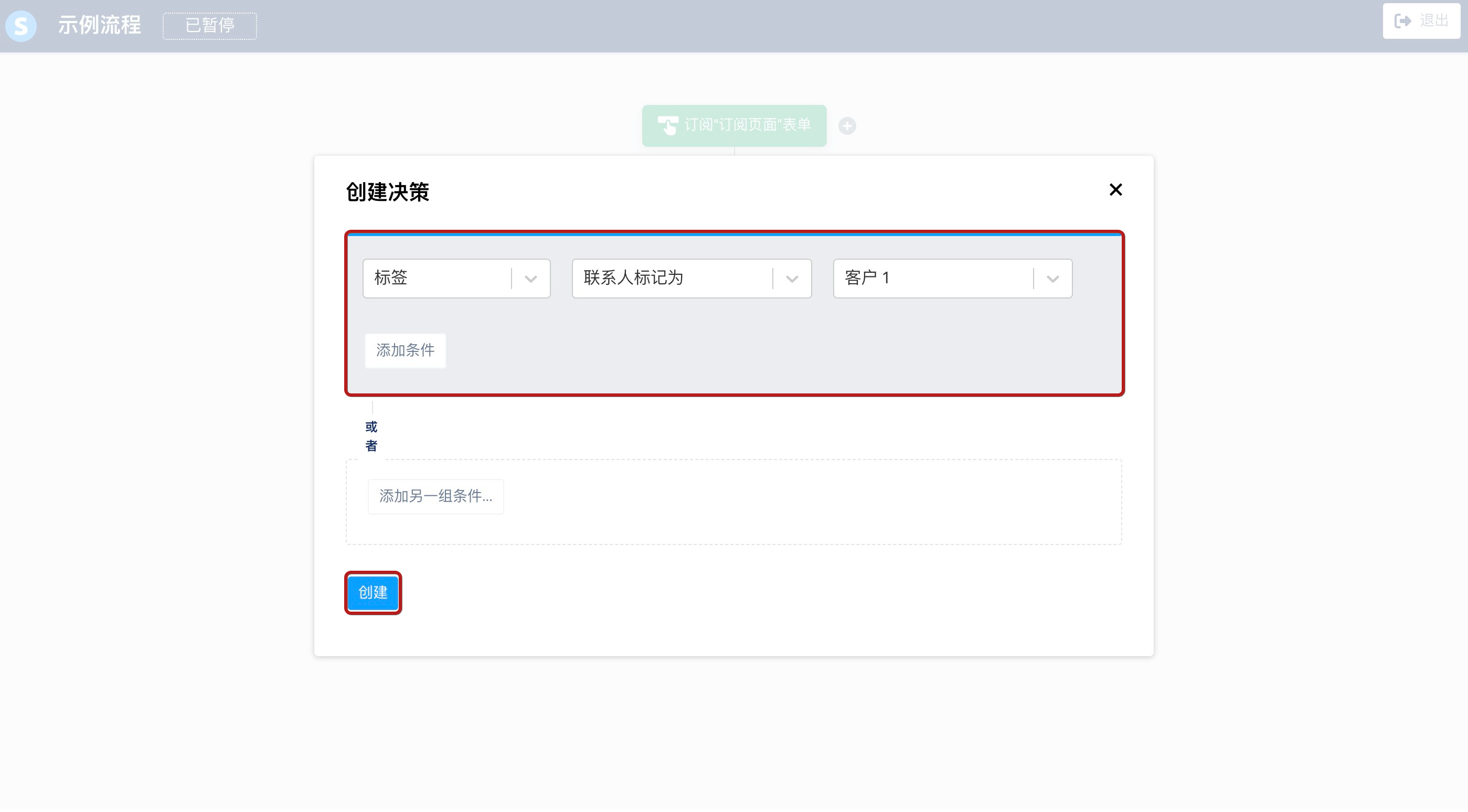 - 添加一个决定:使用标签筛选器 → 联系人标记为 → 选择客户 1