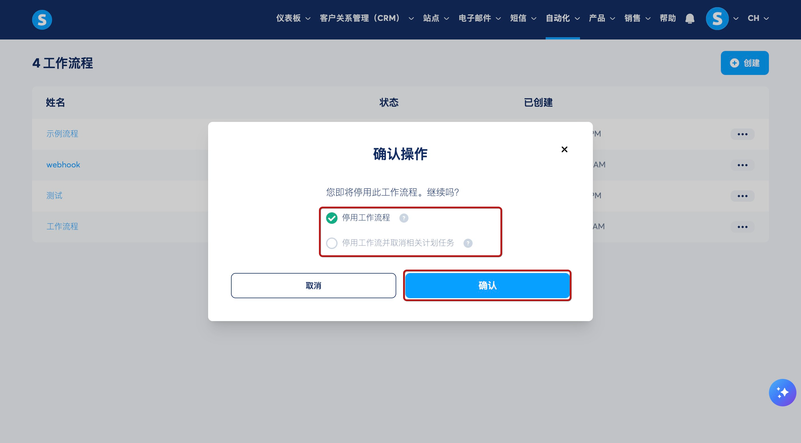 - 停用工作流程:阻止新联系人进入,但现有计划任务将继续执行