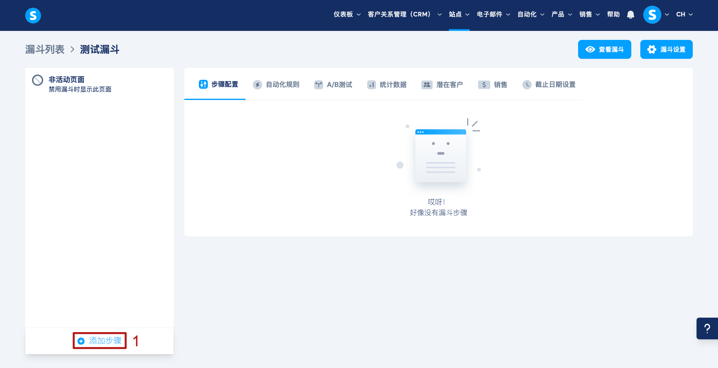 转到要添加付款页面的销售漏斗。在漏斗页面左侧面板上,点击 “添加步骤”(1)。