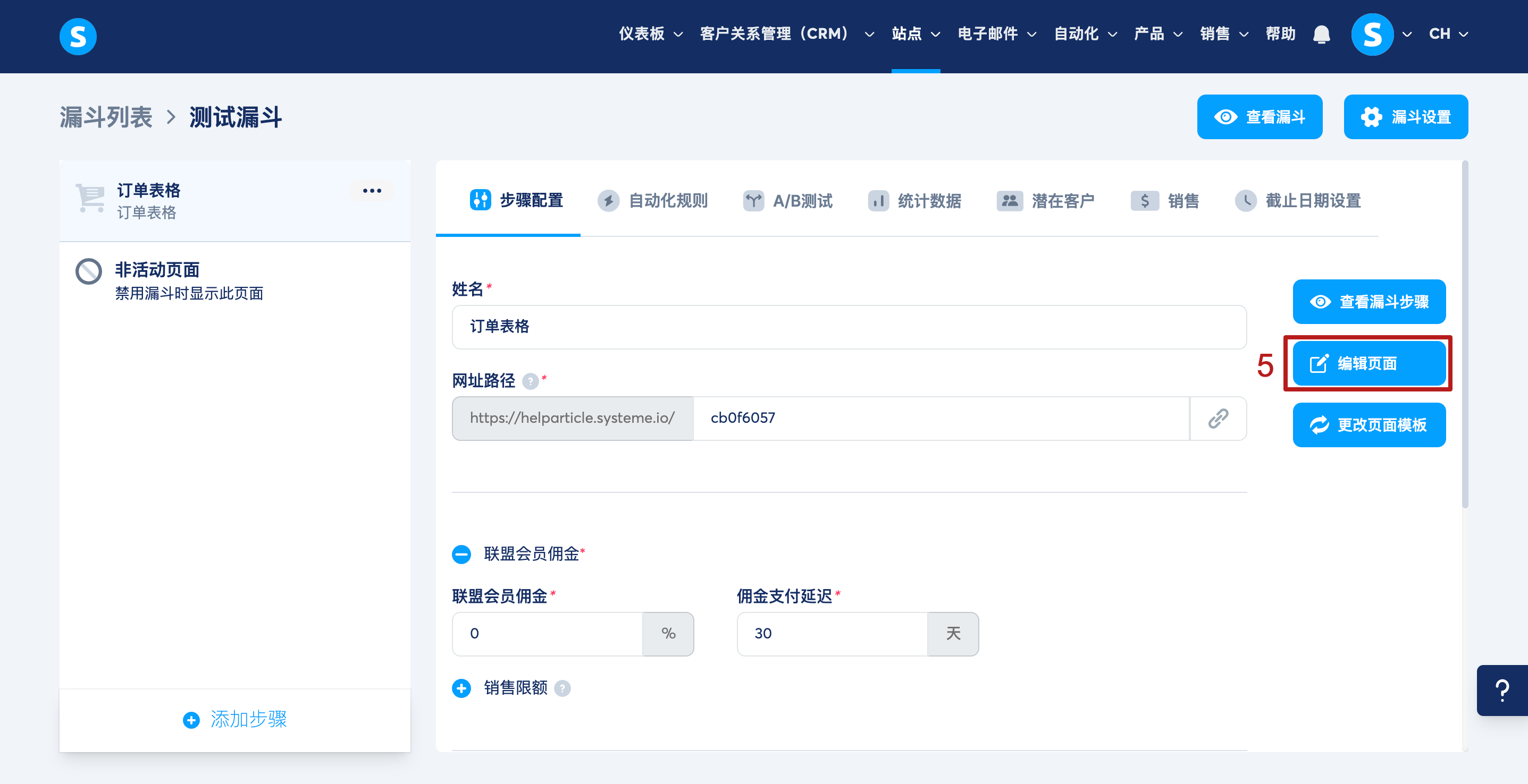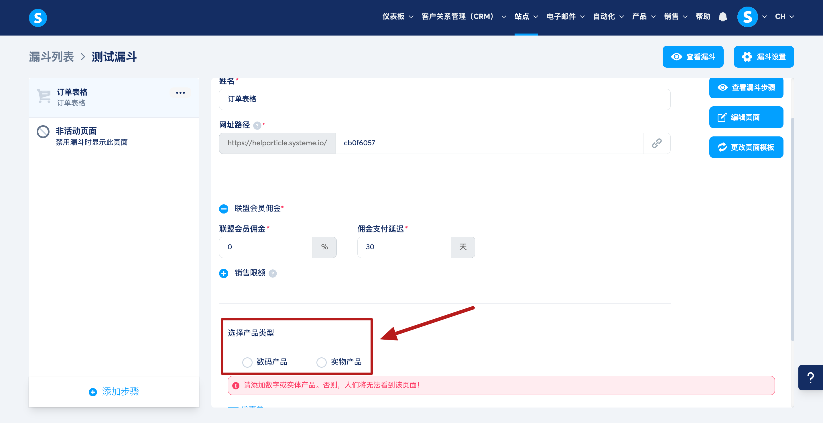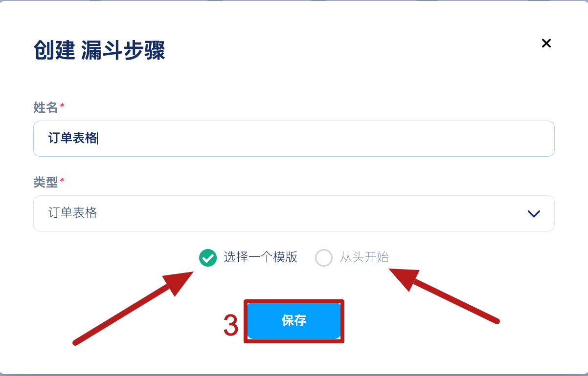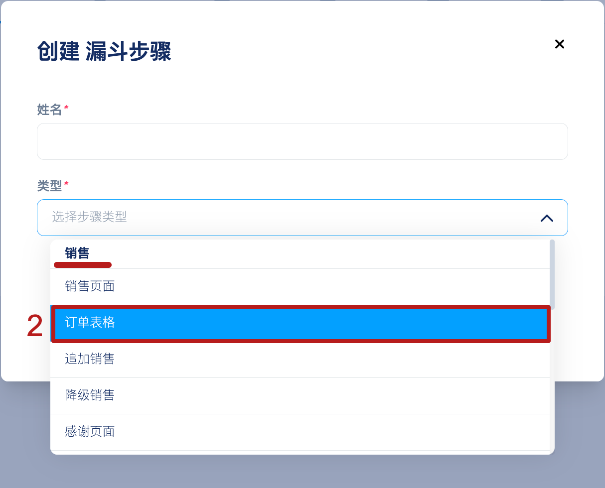 在 “创建漏斗步骤” 弹出窗口中,从 “类型” 下拉列表中选择 “订购表单”( 2)