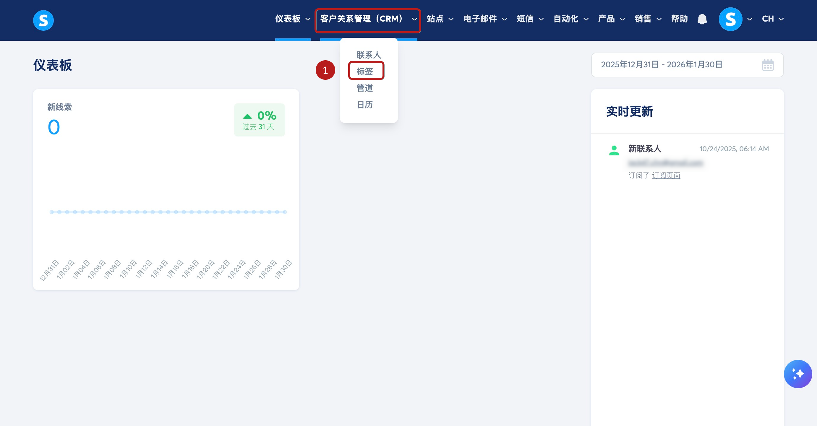 要创建标签,请导航至客户关系管理(CRM)选项卡并点击标签(1)。