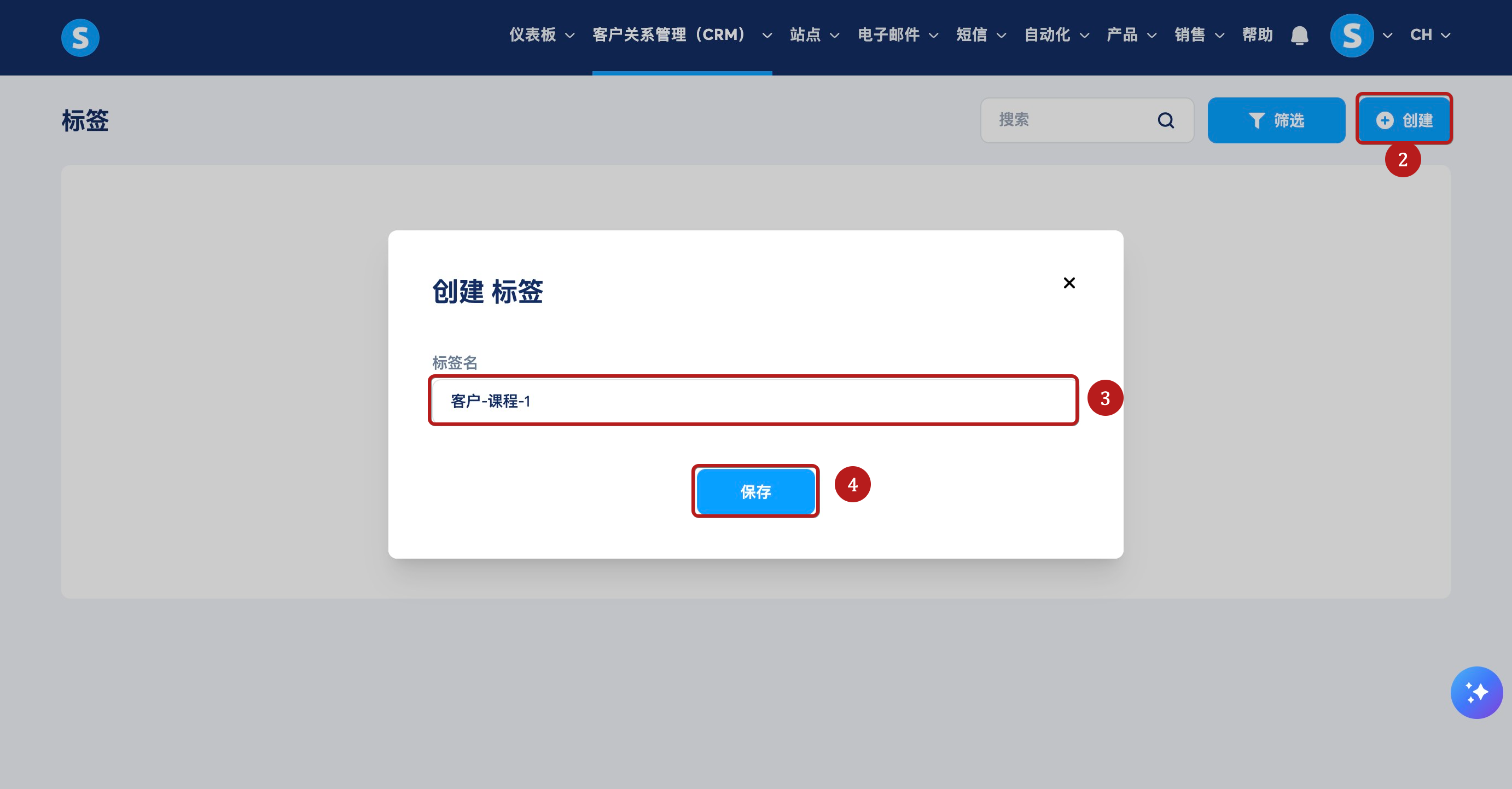 点击创建(2),填写新标签的名称字段(3),然后点击保存进行保存(4)。