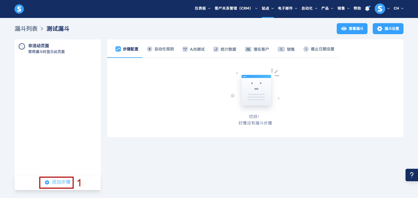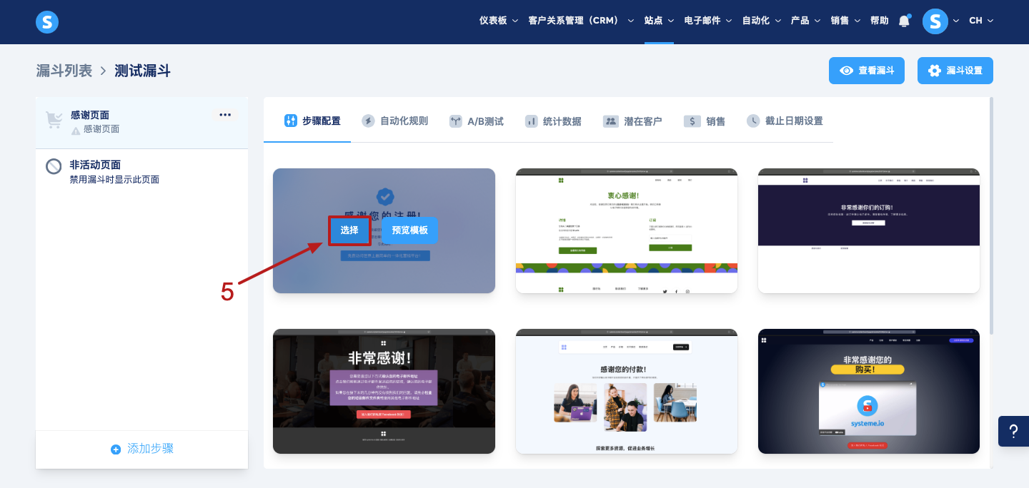 转到您要添加 “感谢” 页面的漏斗,然后在漏斗页面左侧菜单中点击 “添加步骤”(1)