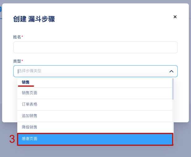 在销售漏斗的“销售”部分选择“感谢页面”。该页面在购买完成后显示,可包含订单摘要,与选择加入感谢页面不同(3)