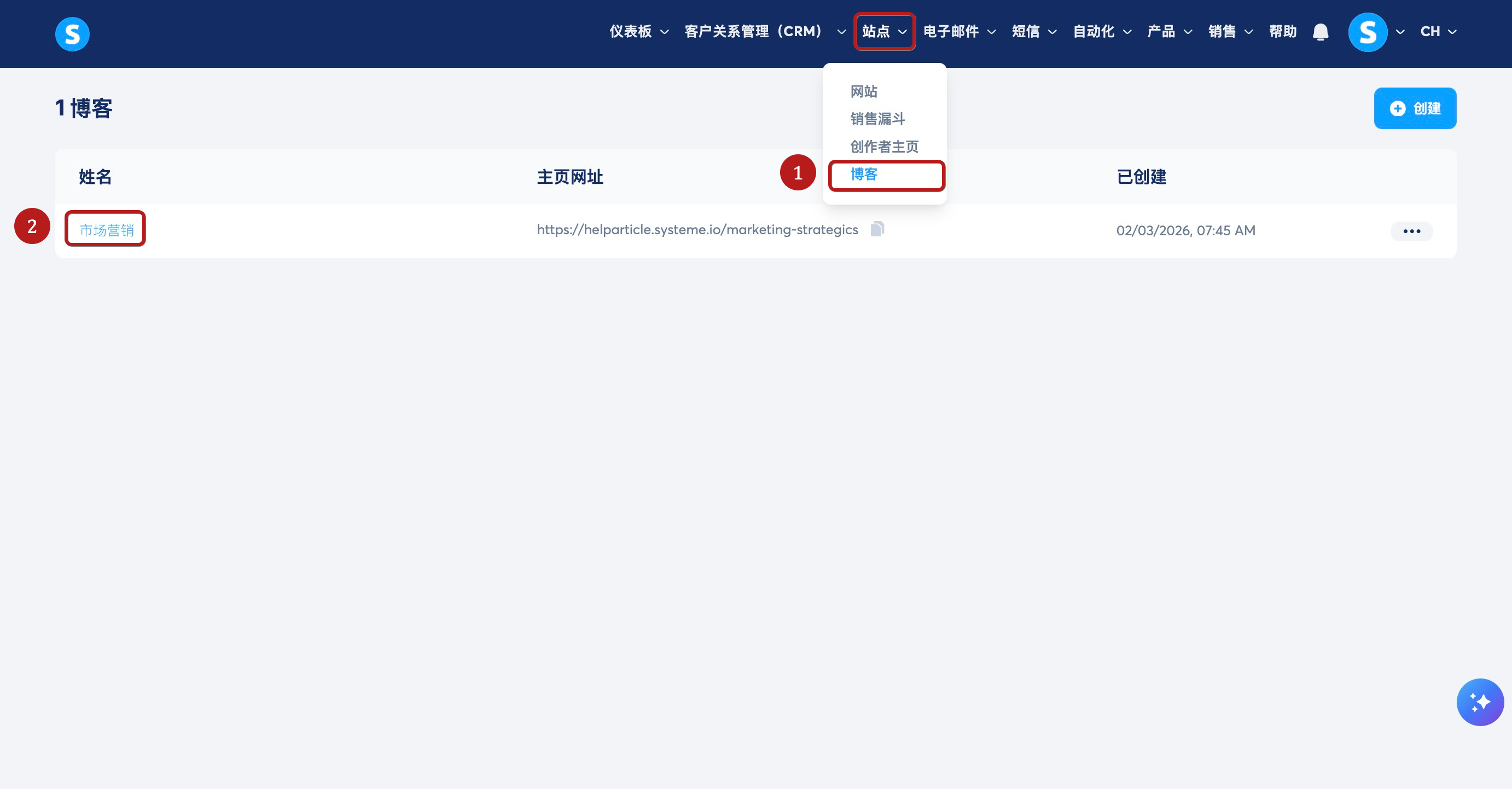 前往站点标签下的博客板块(1),然后点击您的博客名称(2)。