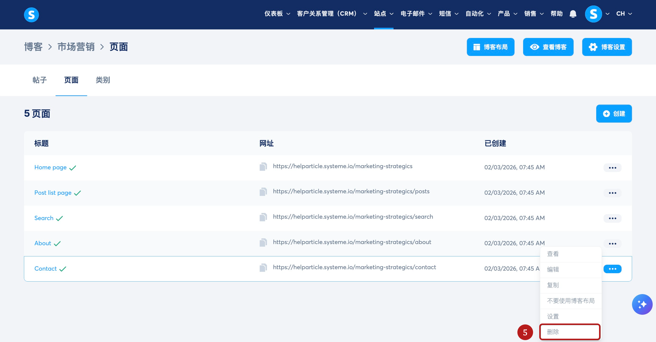 注意:虽然您可以删除关于和联系我们页面(5),但首页、文章列表页和搜索页是必需页面,不可删除。