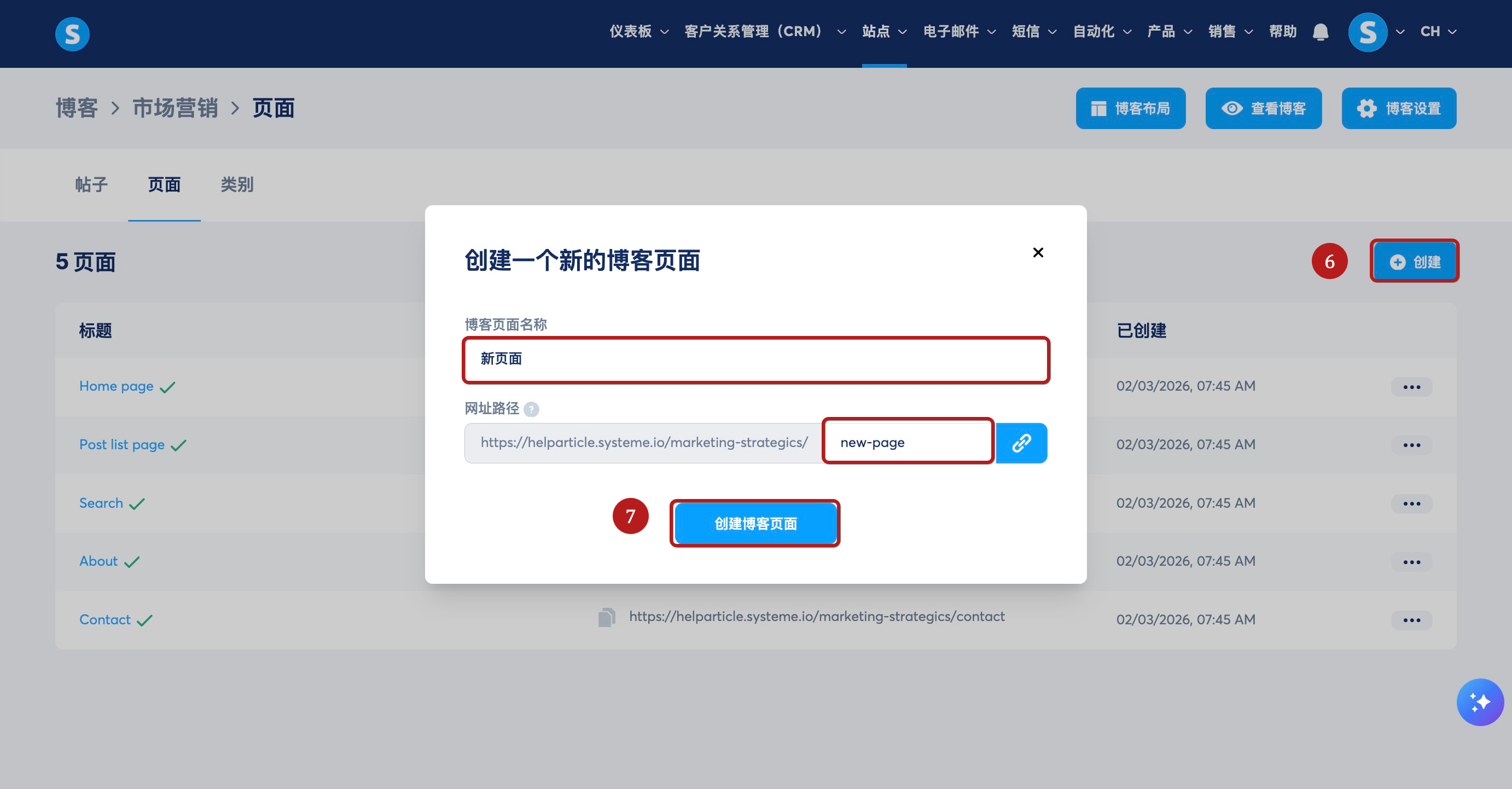 要创建新的博客页面,请单击创建按钮(6)。显示弹出窗口时,填写博客页面名称和URL路径字段。