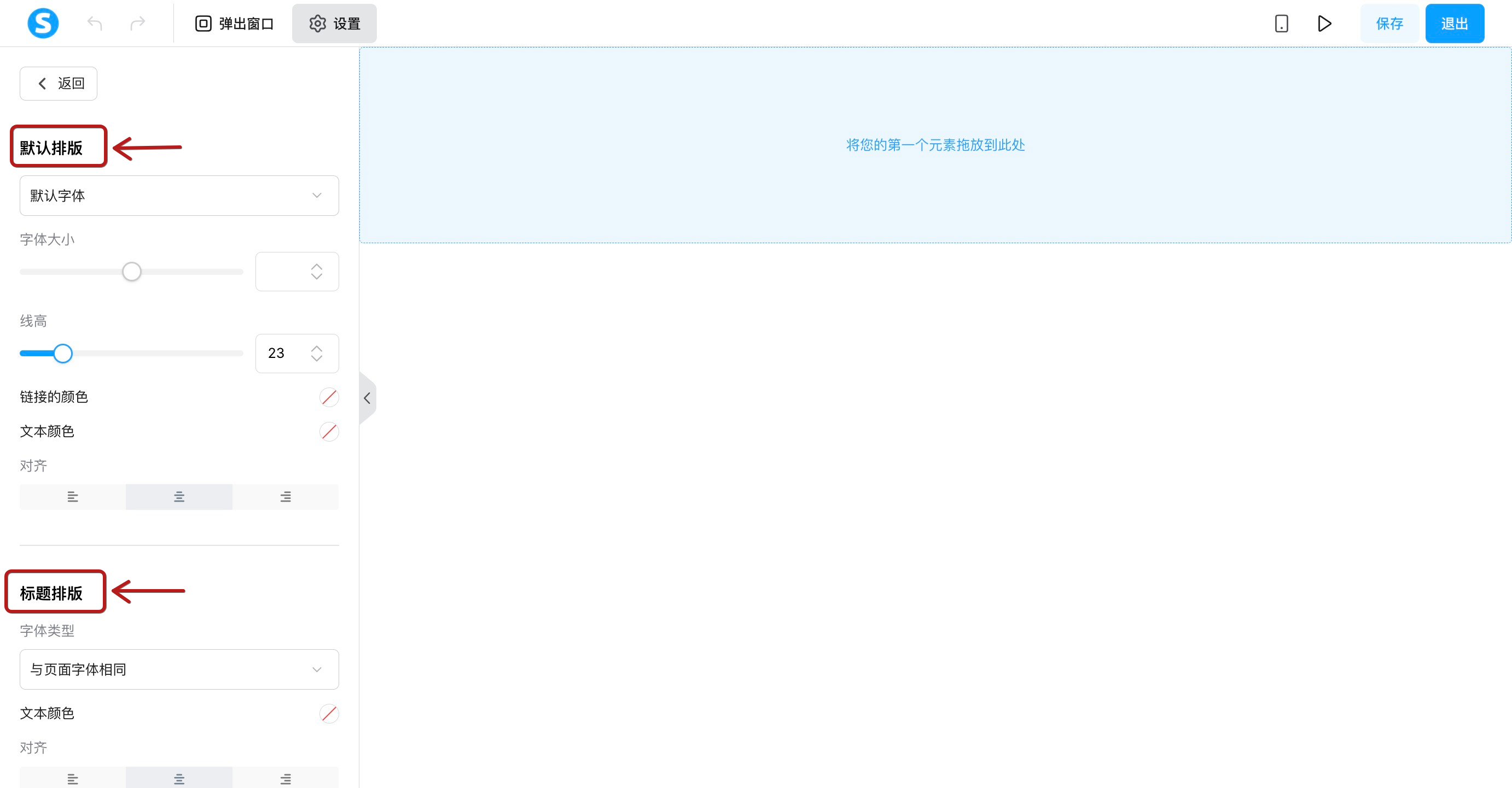 在页面编辑器中,您可以修改默认排版和标题排版,以及将元素拖放到页面上。