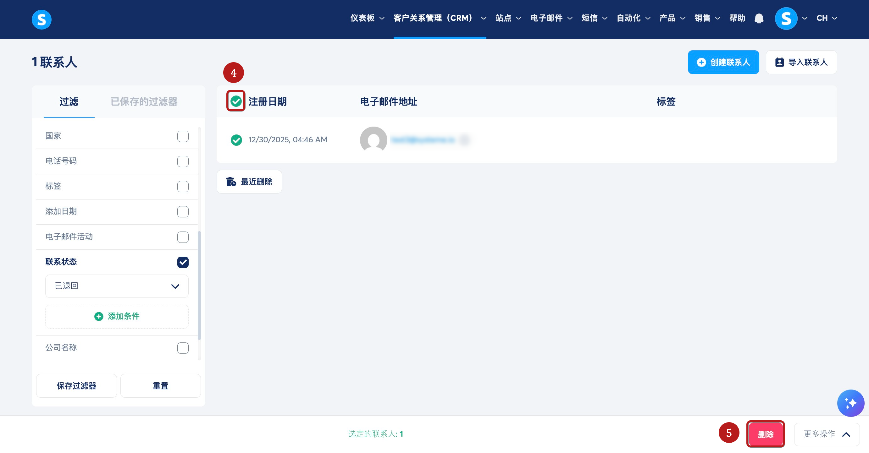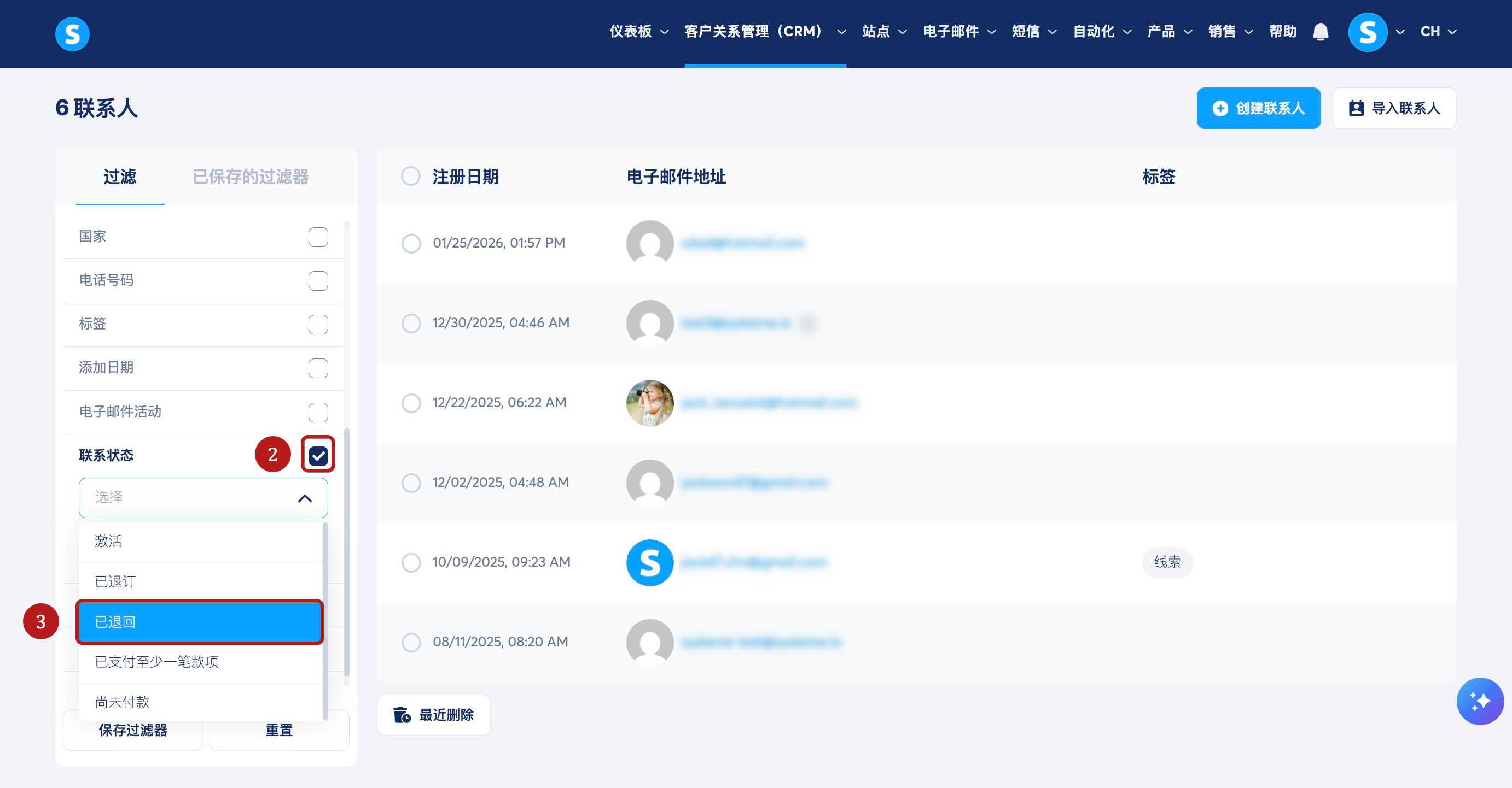 点击 "联系人状态" 复选框(图片中的数字 2),然后从选项列表中选择 "已退信" 来过滤列表(图片中的数字 3)。应用过滤器后,您将看到已退信的联系人列表。
