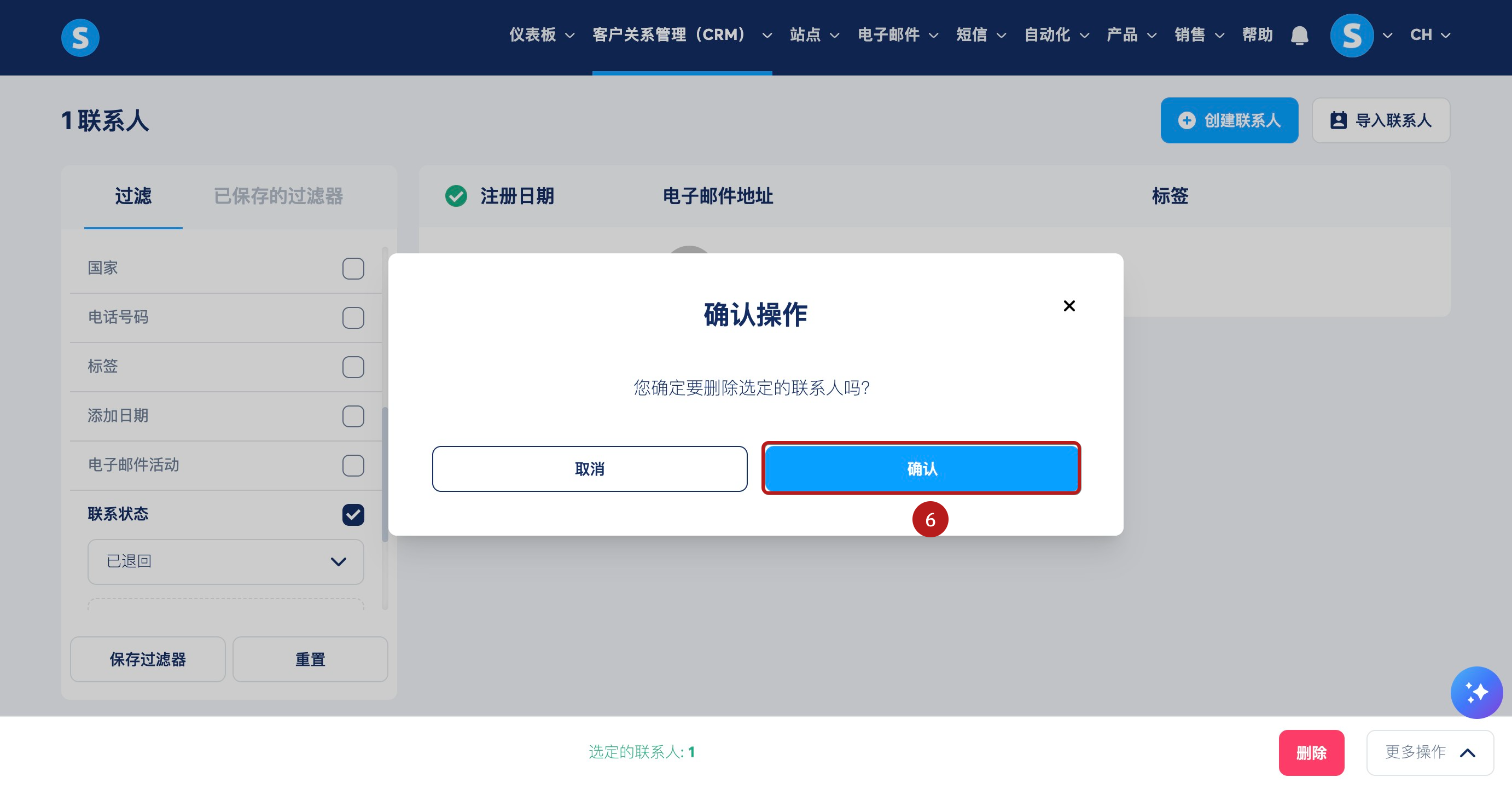 最后,点击 "确认",从列表中删除联系人(图片中的数字 6)。