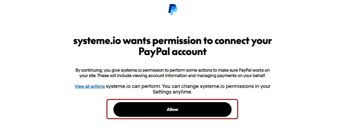 登录后,PayPal将显示一个权限页面,要求您授权systeme.io连接您的账户。点击“允许”按钮即可授予权限。