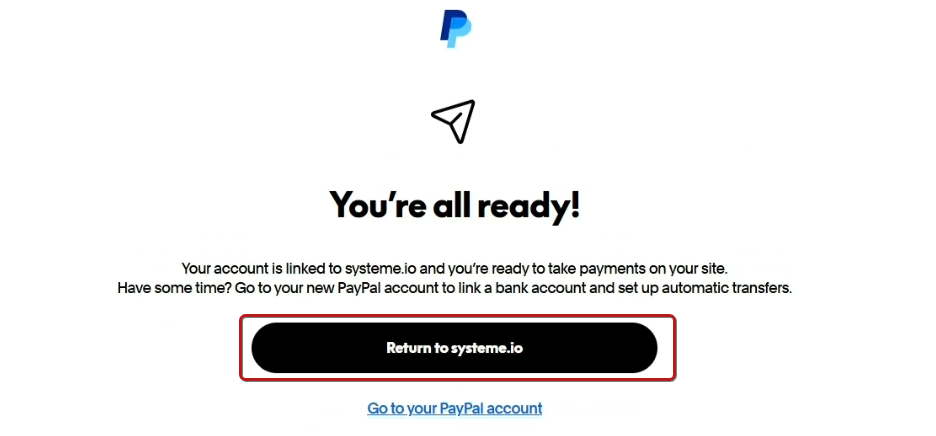 授予权限后,PayPal 将确认连接已准备就绪。点击“返回 systeme.io”即可回到您的 systeme.io 账户。