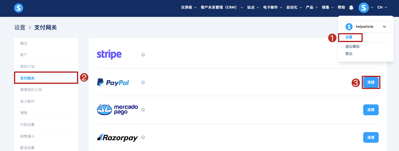 从左侧的设置菜单中,单击“支付网关”(2),然后单击“连接”的PayPal选项(3)。