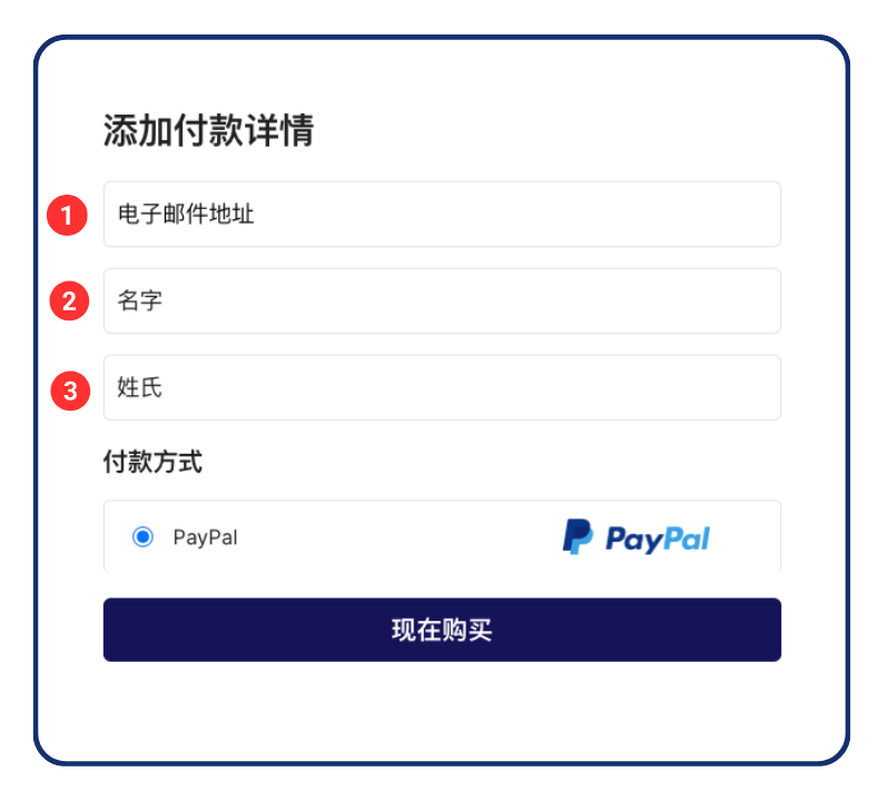 注意: 要通过PayPal处理付款,您需要在所有订单表单中添加电子邮件地址(1)、名字(2)和姓氏(3)字段