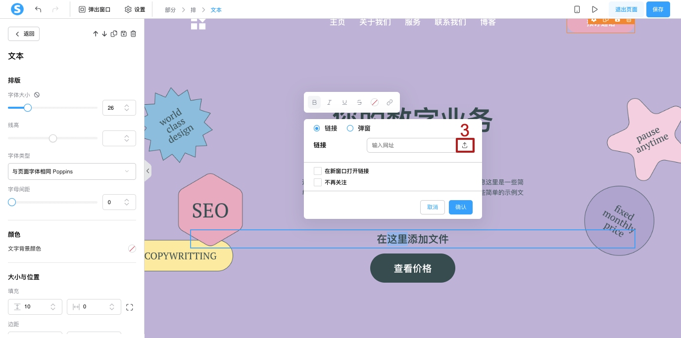 将弹出一个窗口,供您上传文件。操作时请点击链接字段旁边的箭头图标(3)。