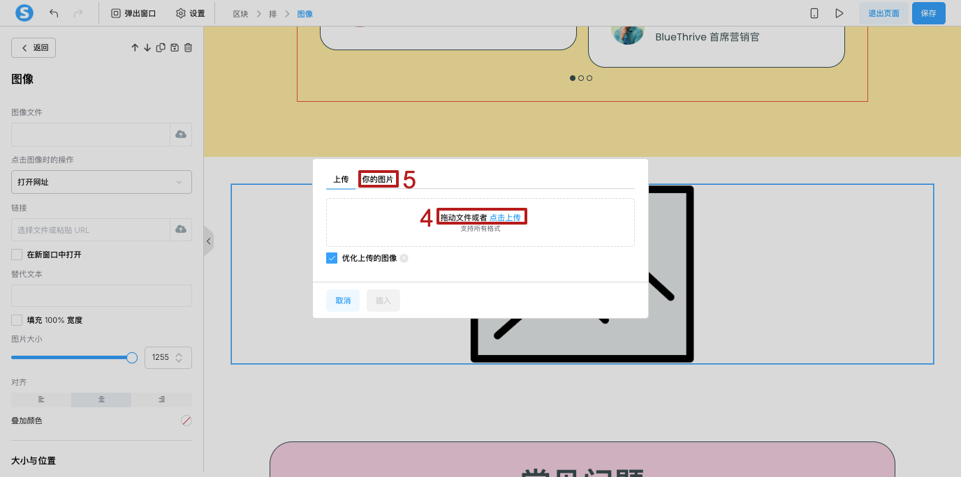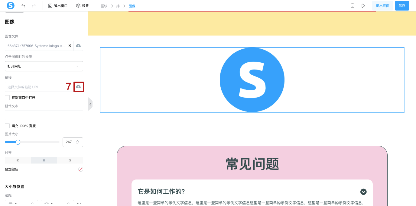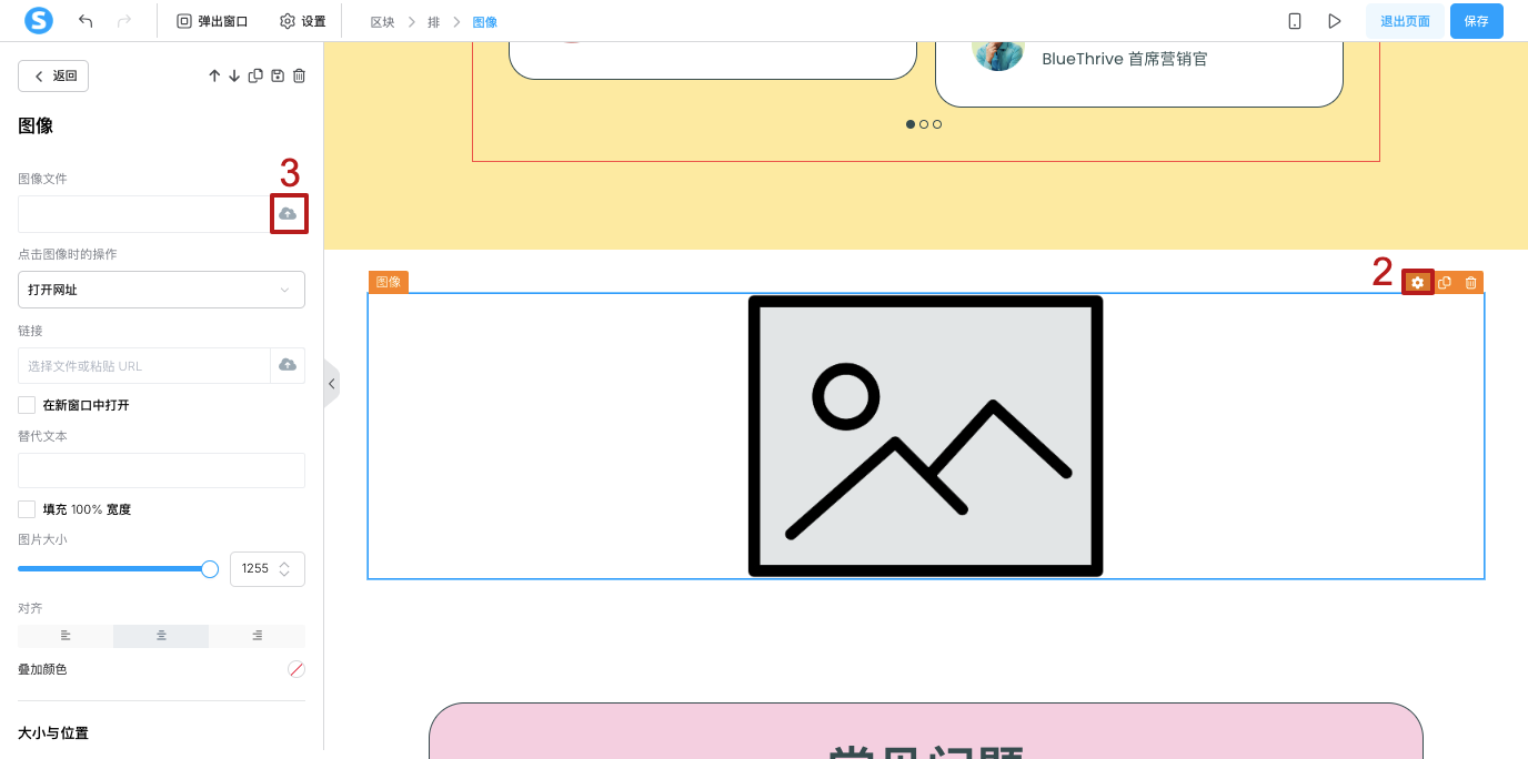 点击设置按钮(2)以打开左侧的元素面板。然后点击云朵形状的按钮插入您的图片(3)。