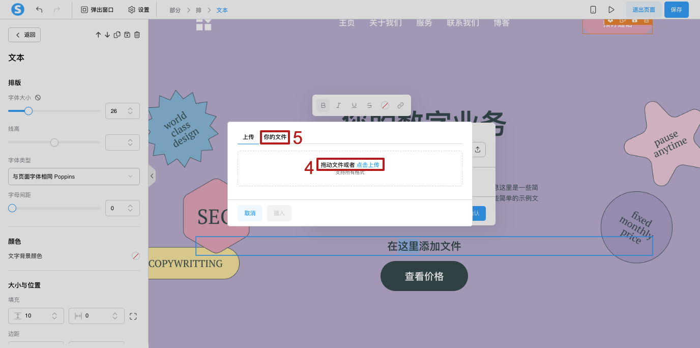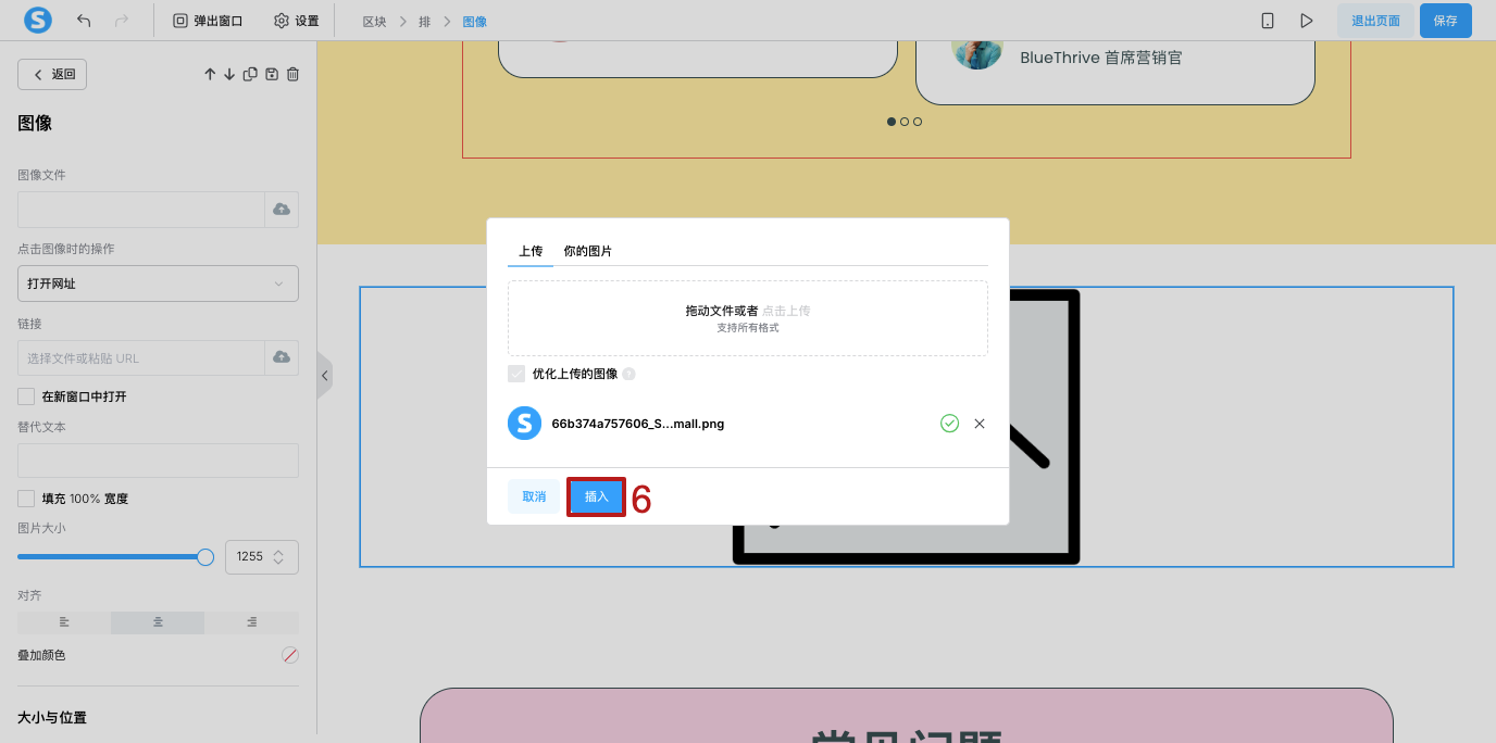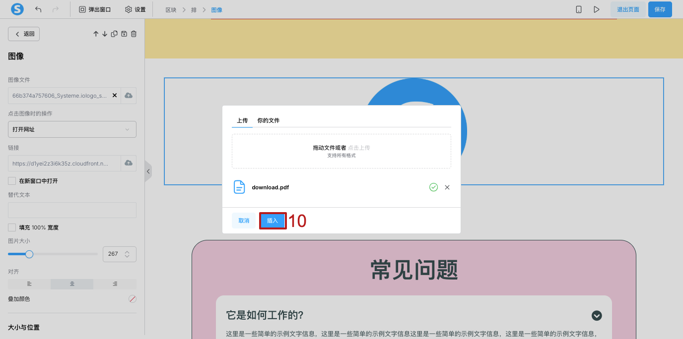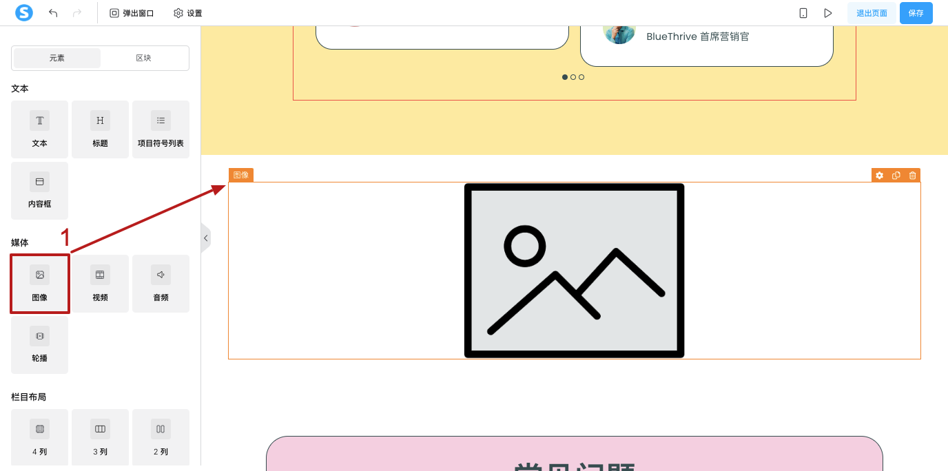 点击设置按钮(2)以打开左侧的元素面板。然后点击云朵形状的按钮插入您的图片(3)。