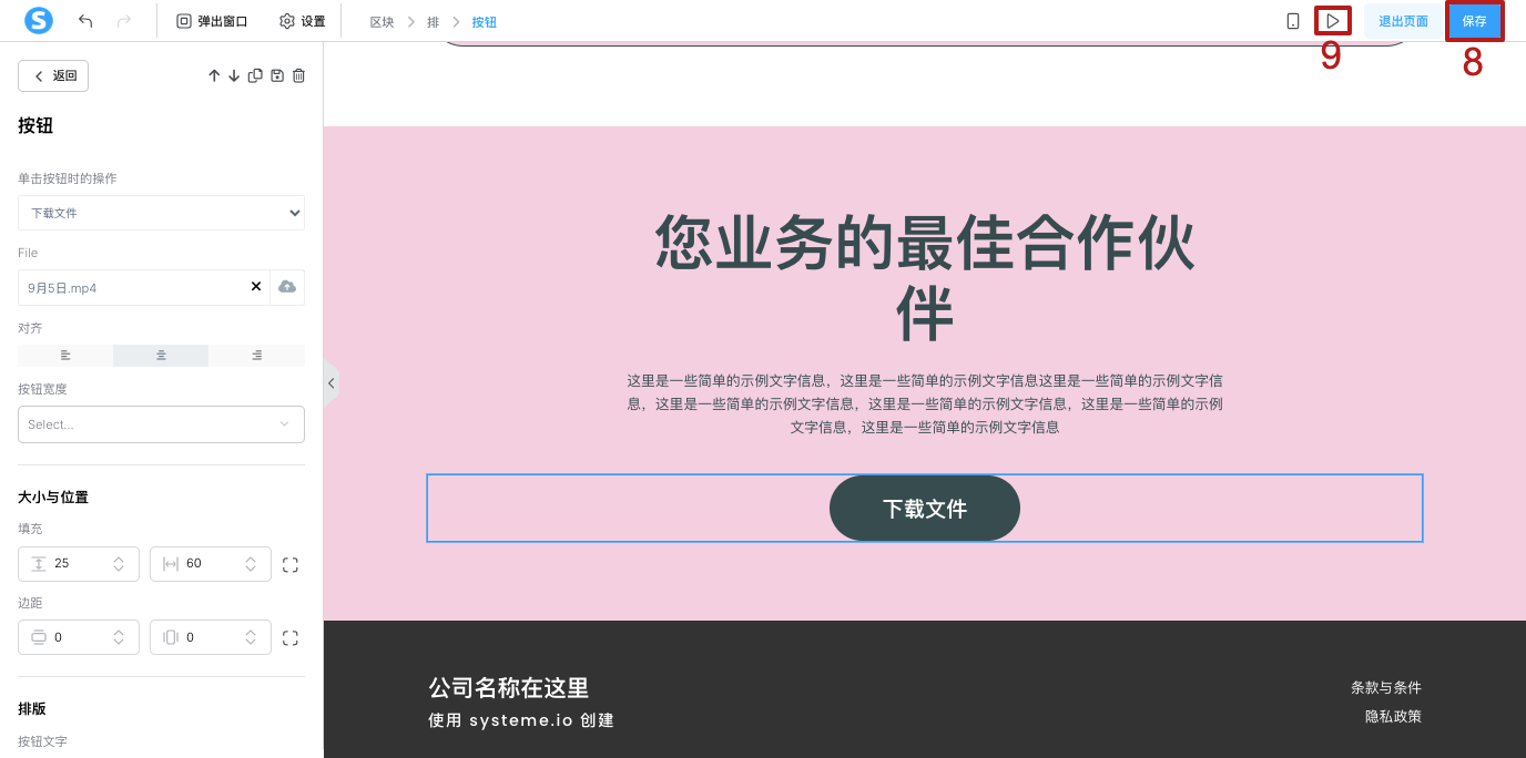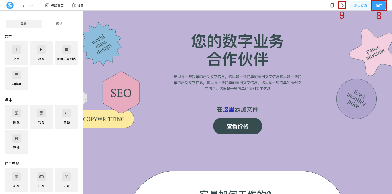 操作步骤如下:首先点击保存按钮(8)保存页面,然后点击预览按钮(9)。