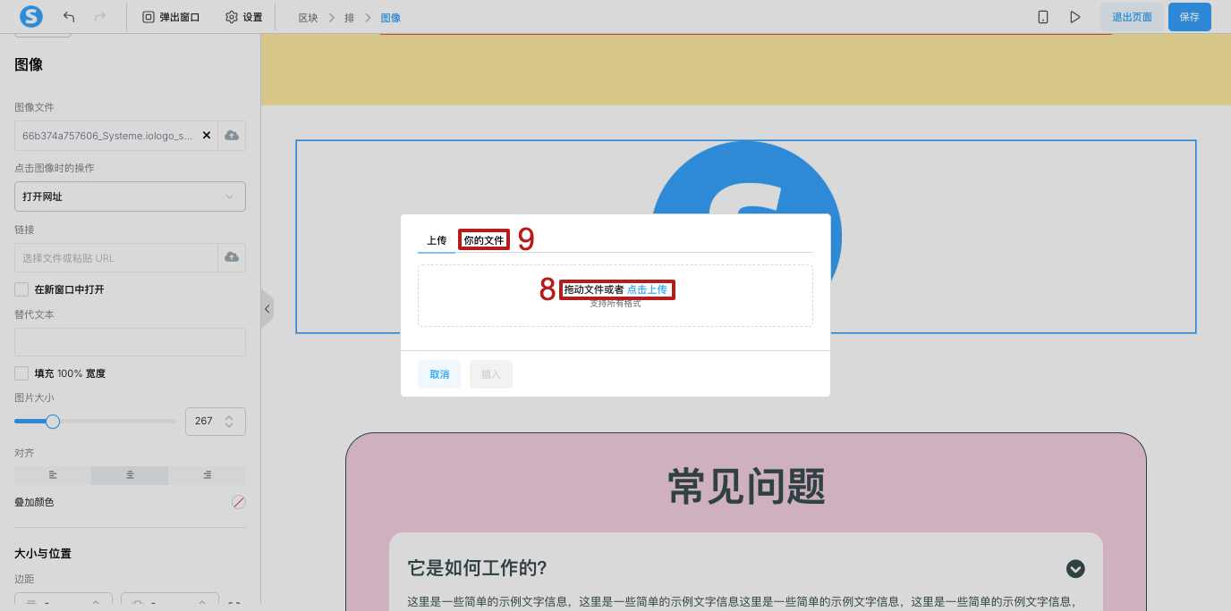 将出现一个窗口供您上传文件。您可以将文件拖拽至上传区域,或浏览设备选择文件(8)。