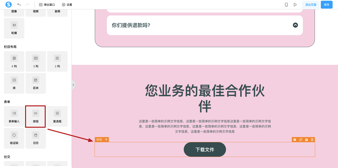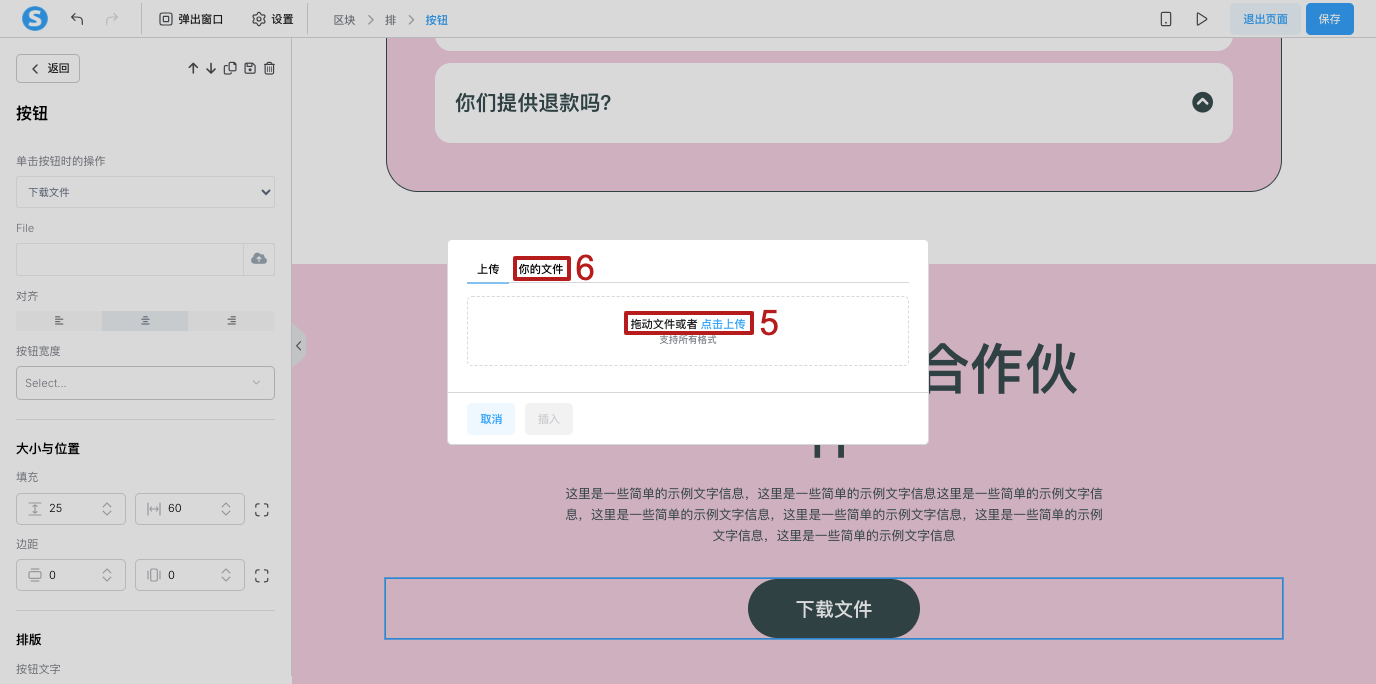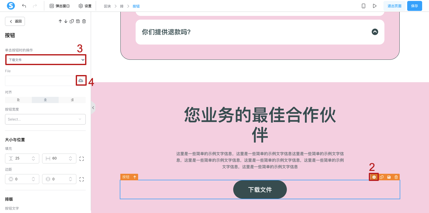 点击按钮参数(2),选择下载文件按钮操作(3),然后点击云状按钮(4)插入文件。