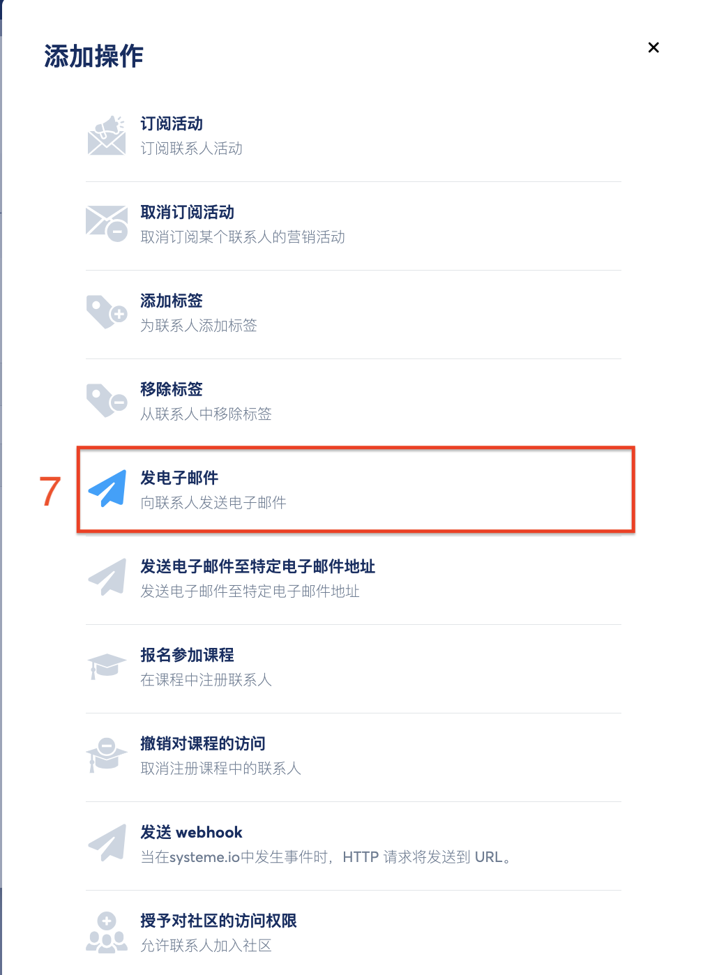 在出现的 “添加操作” 弹出窗口中,选择 “发送电子邮件” 操作(图中数字 7)。