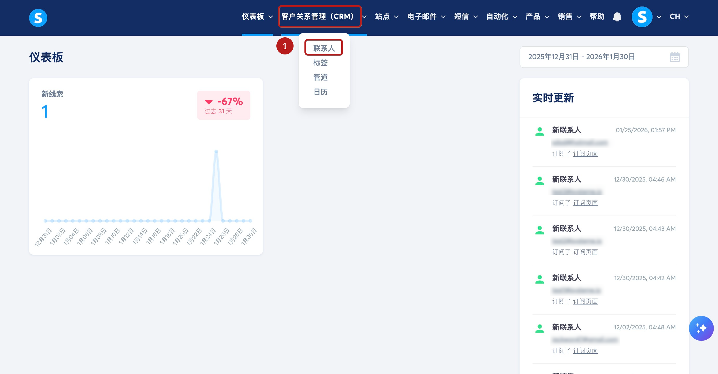 点击客户关系管理(CRM),然后点击联系人(1)。