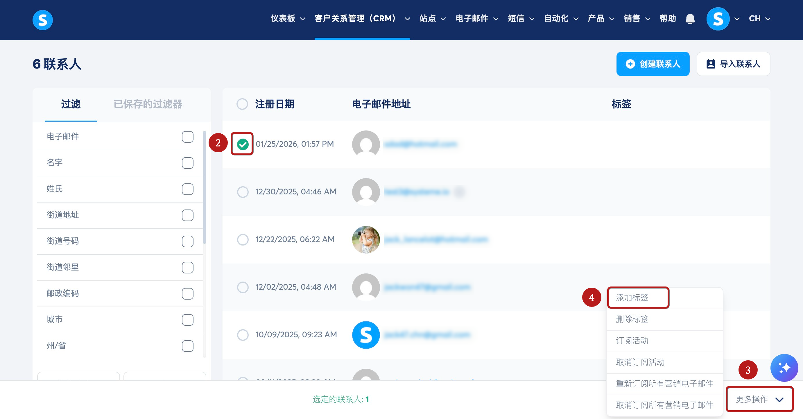 选择要为其分配标签的联系人(2),然后点击更多操作(3)并选择添加标签(4)。