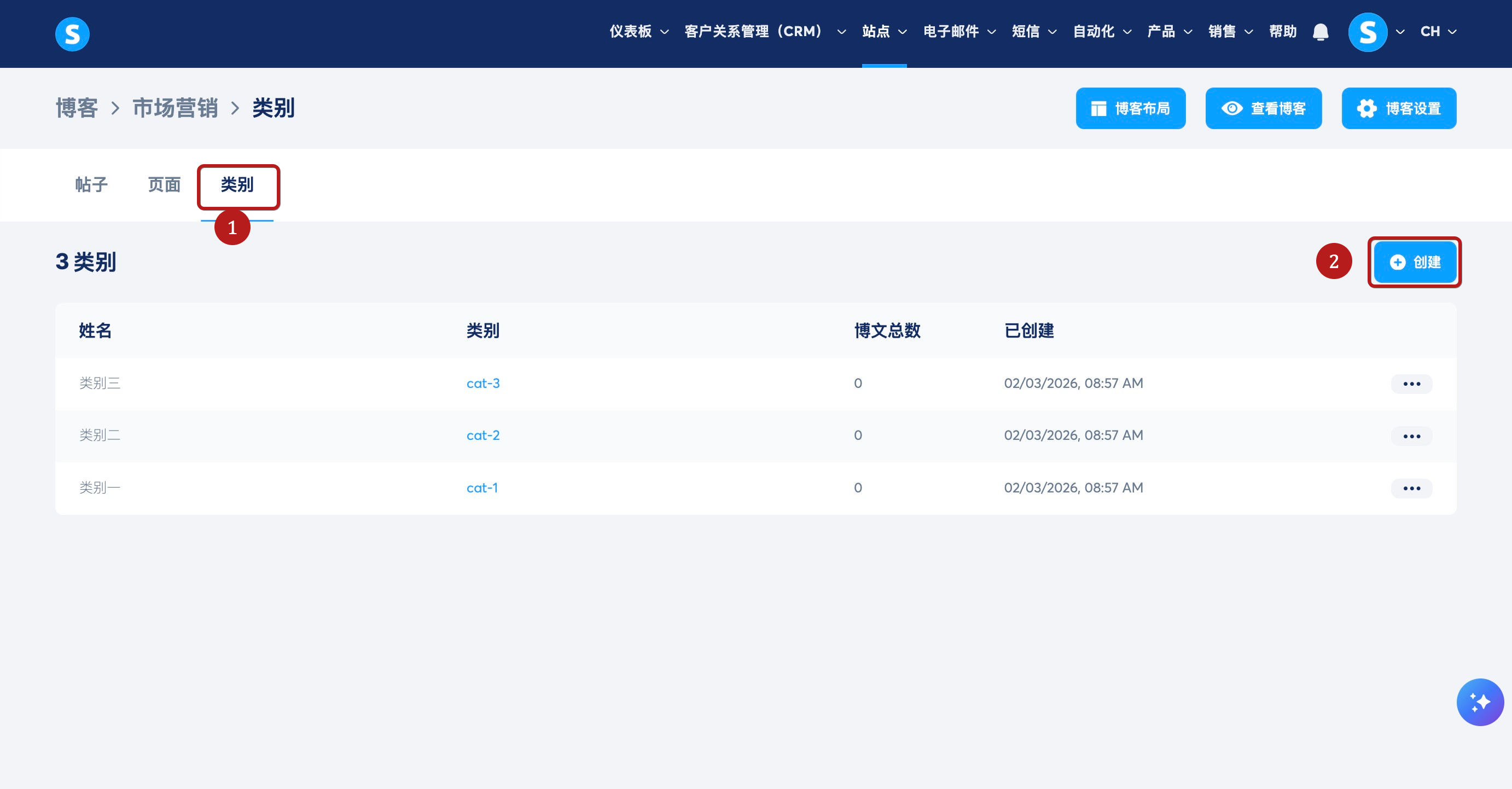 要创建一个类别,只需进入博客的类别部分(1),然后点击创建(2)