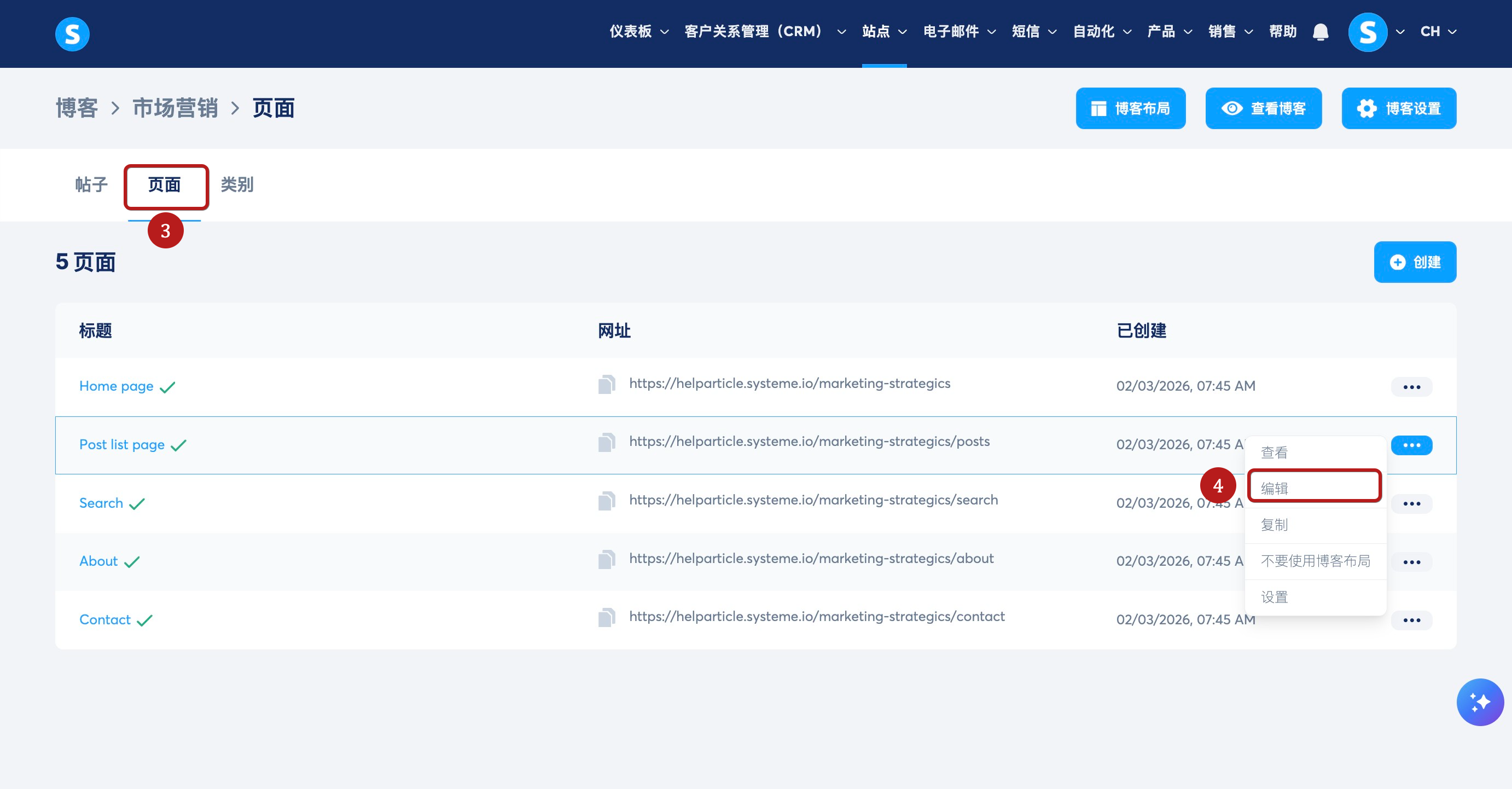 进入博客菜单后,请先进入页面部分( 3 ),然后点击文章列表页面( 4 )页面的编辑图标。