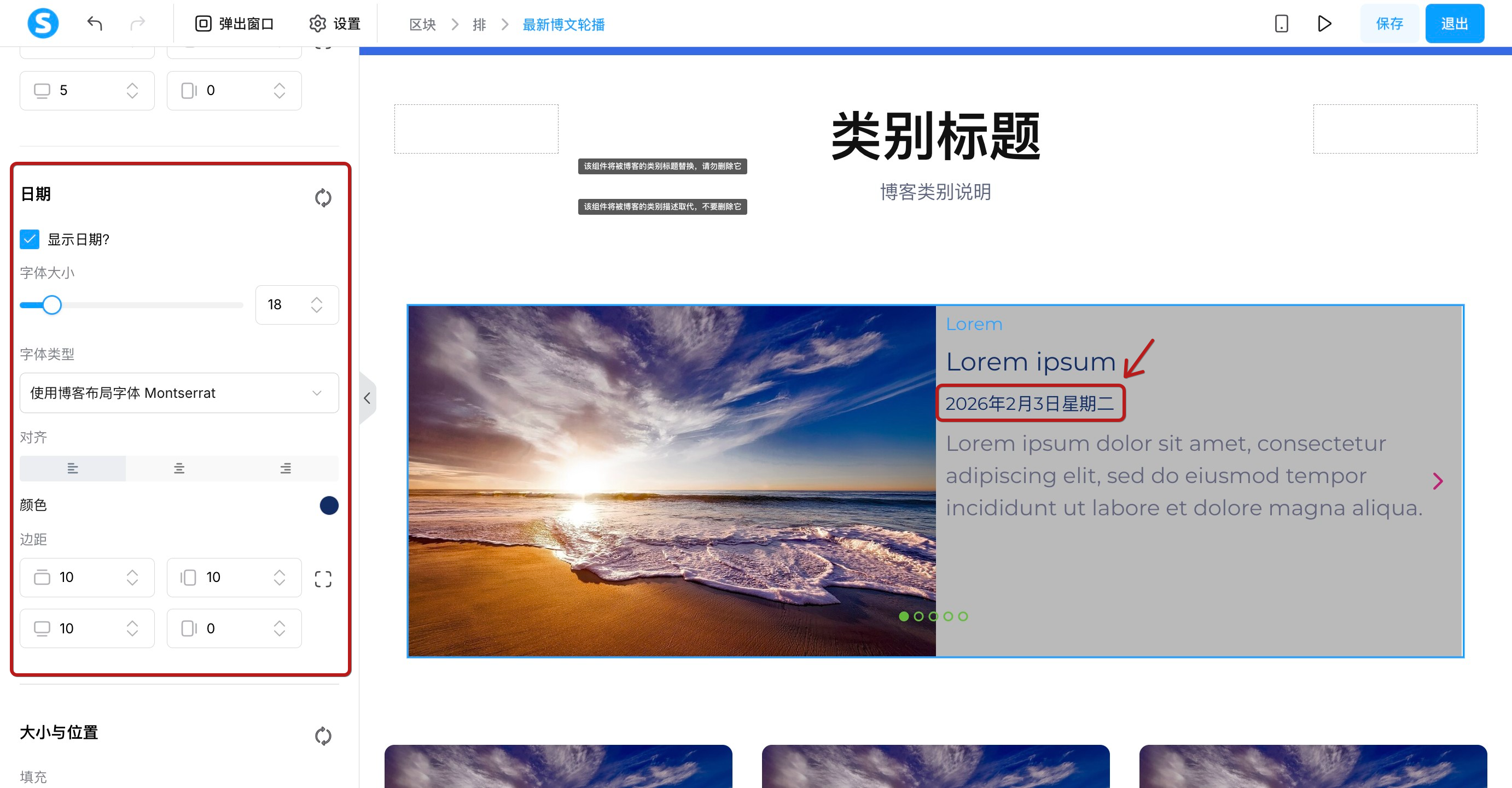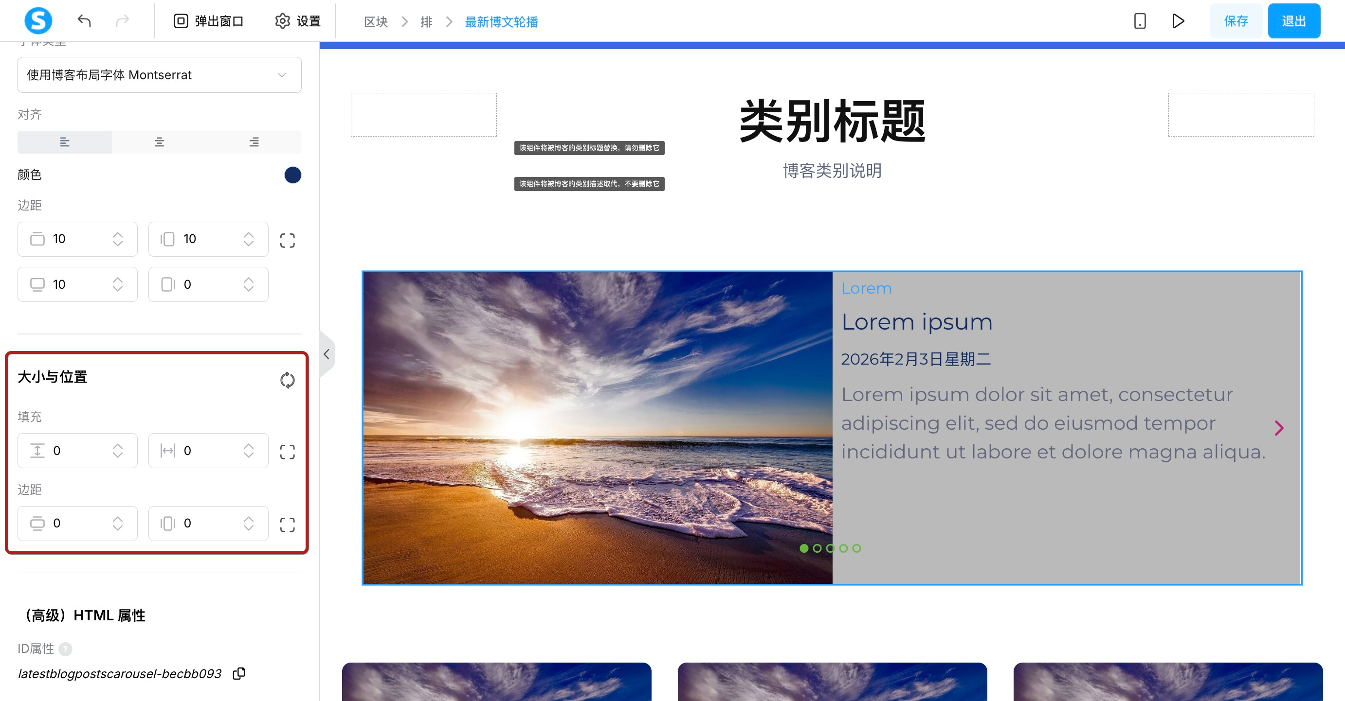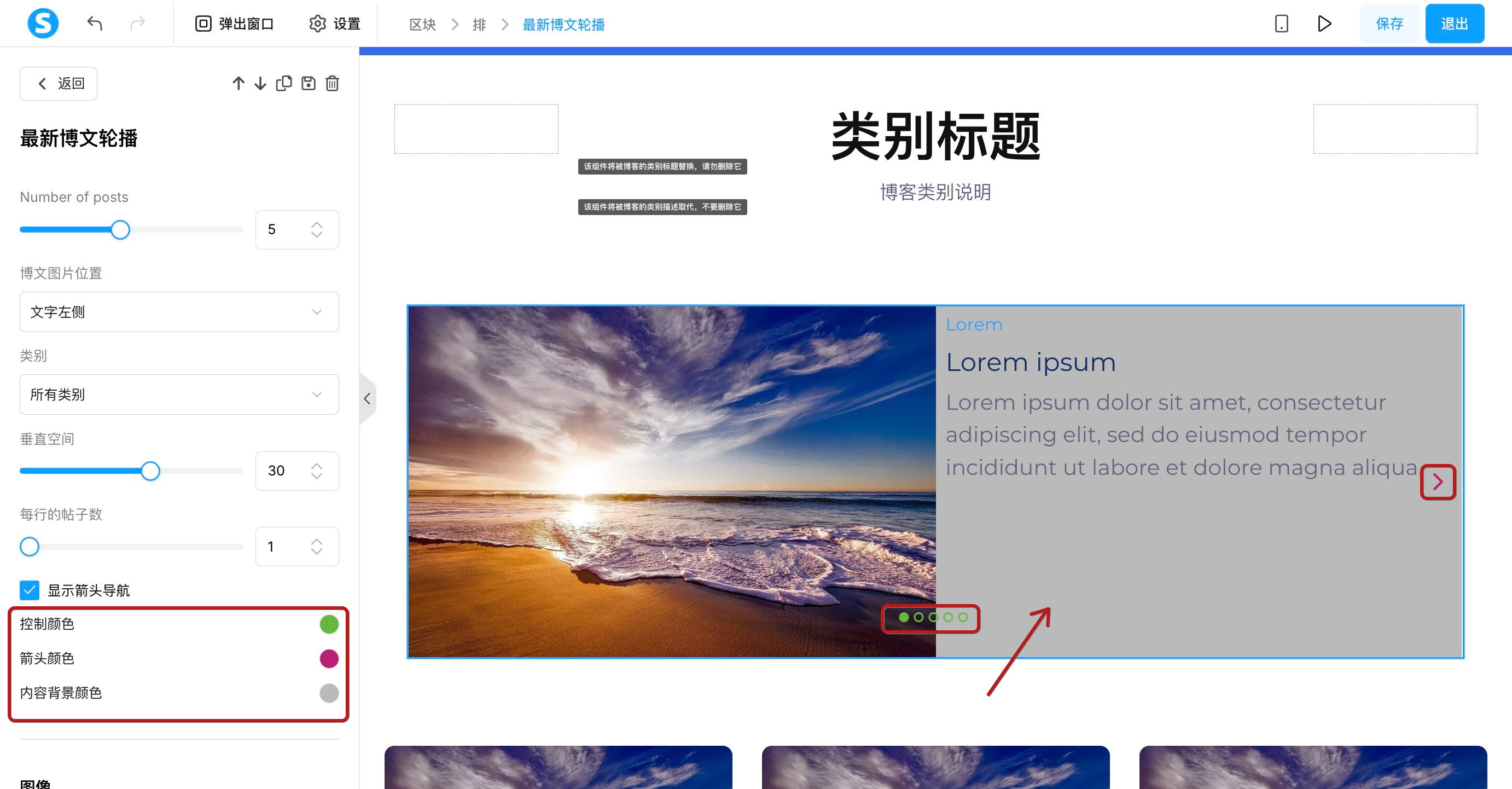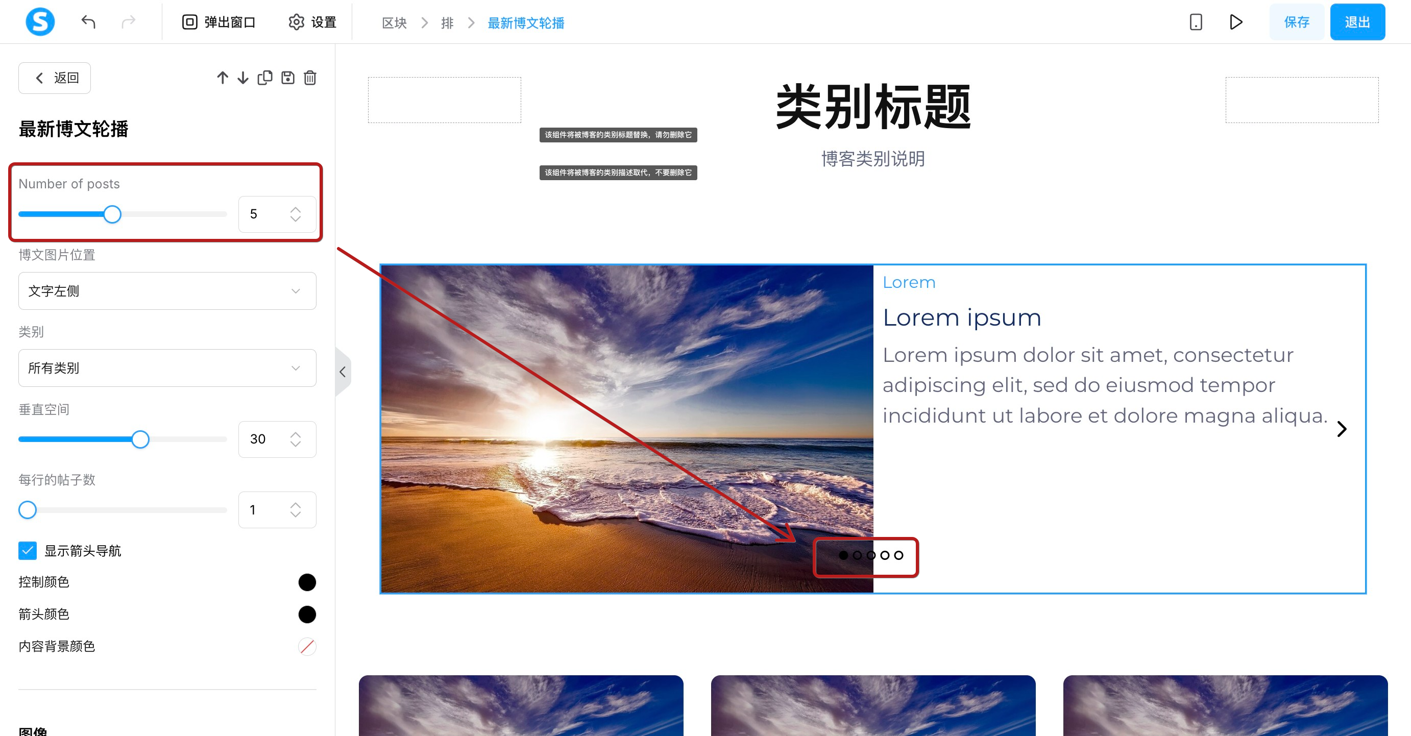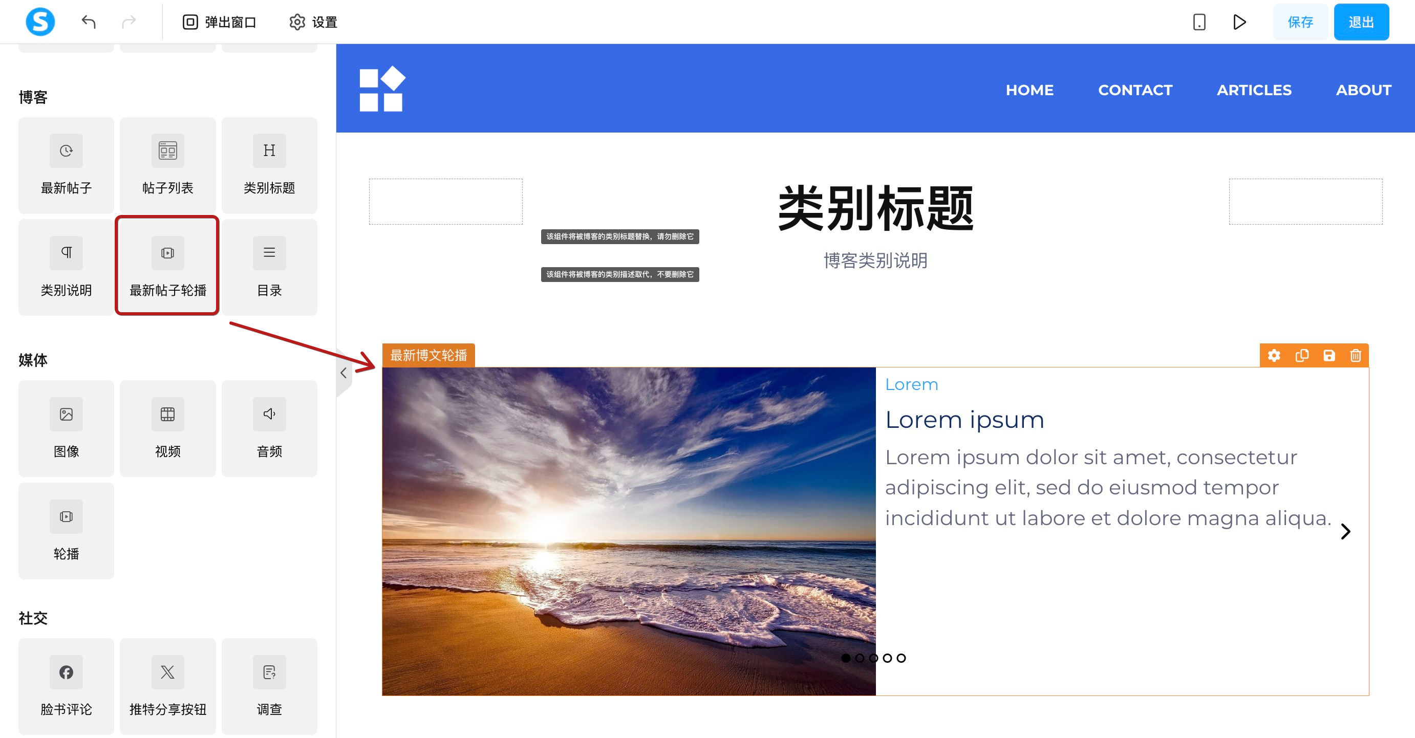 进入帖子列表页面的编辑器后,拖动最新博客帖子轮播元素并将其放到页面上,帖子就会自动出现在该元素上。