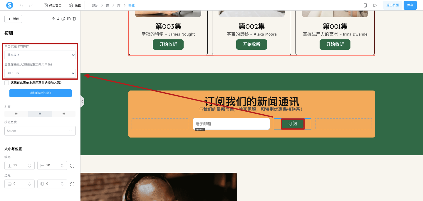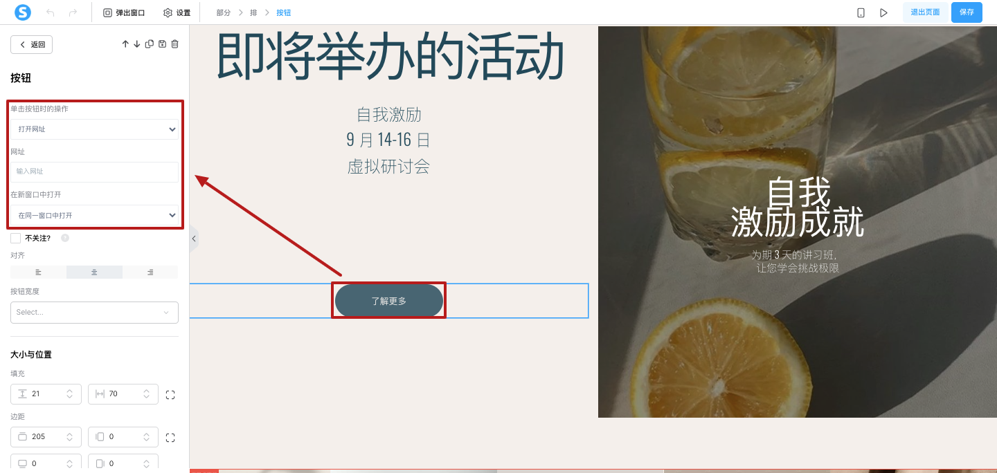 - 对于 “单击按钮时的操作”,请选择 “重定向到页面”。