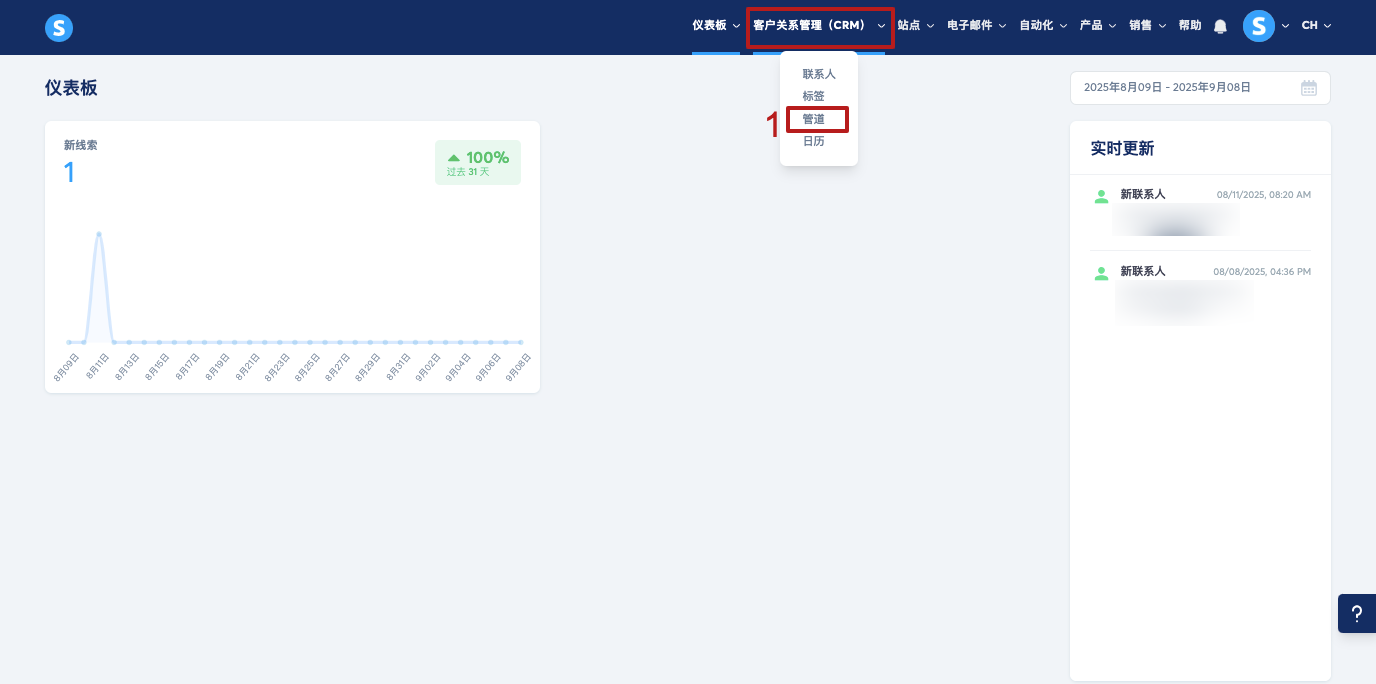 要在 systeme.io 上创建管道,前往您账户菜单中的“客户关系管理(CRM)”,然后点击“管道” (1)。
