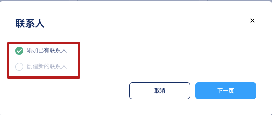 注意:您可以从联系人列表中的可用联系人中选择来添加现有联系人,或者通过手动输入其信息来添加新联系人。