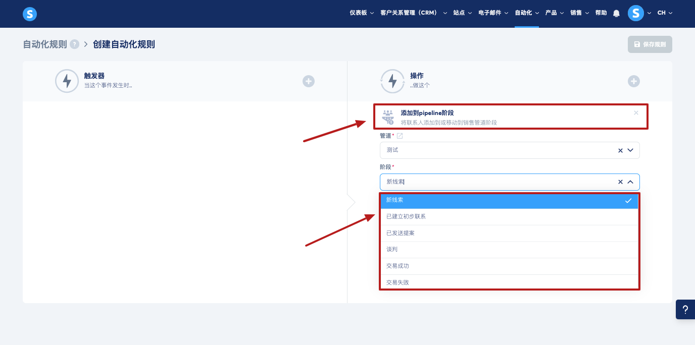 2.自动:通过自动化规则将潜在客户添加到特定阶段或从一个阶段转移到另一个阶段,使流程更顺畅、更高效。这简化了商机管理,避免重复的人工干预,并确保潜在客户在销售管道中正确推进