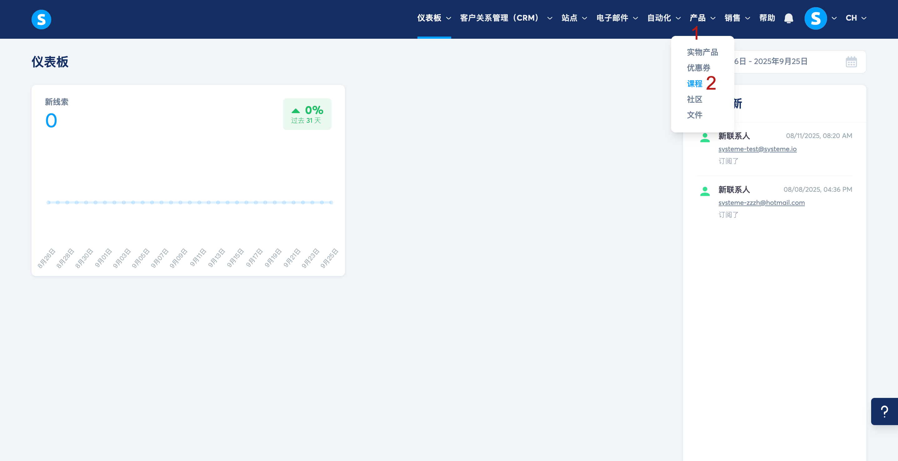 首先,从您的仪表板进入产品选项卡(1),然后选择课程(2)。