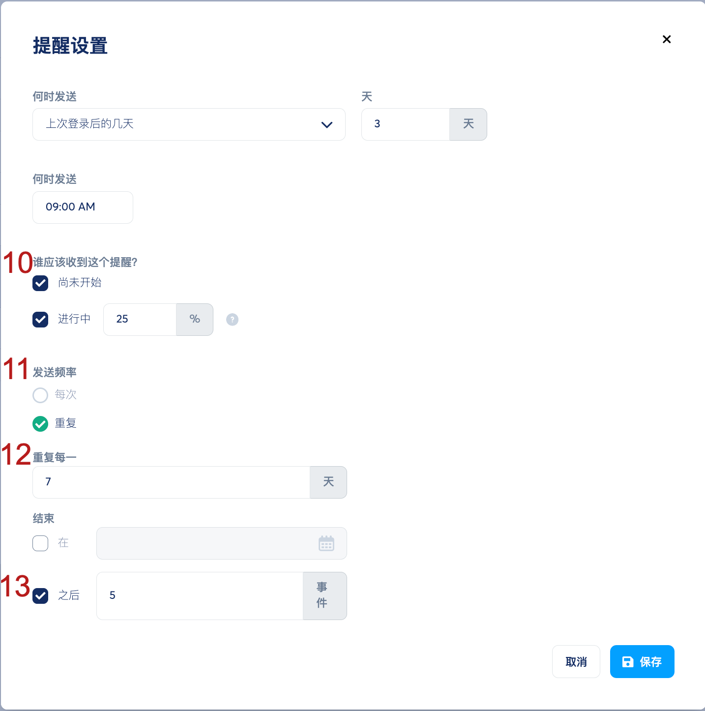 两种选项可同时启用,既能提醒从未开始学习的学生,也能提醒中途暂停的学生(10)。