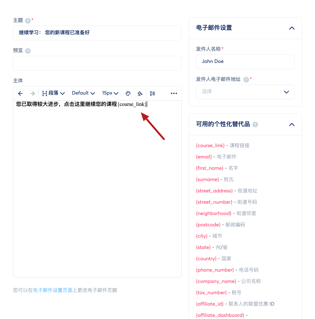 {course_link}– 自动替换为课程的直接链接这使得创建引导学生回到中断处或鼓励他们开始学习的消息变得轻松简单。